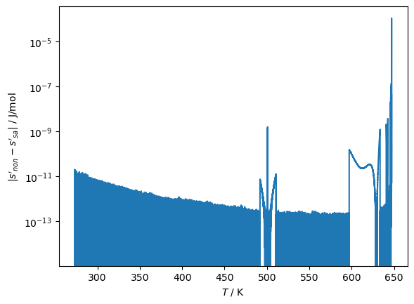 plt.ylabel(r"$|s'_{non} - s'_{sa}|$ / J/mol")