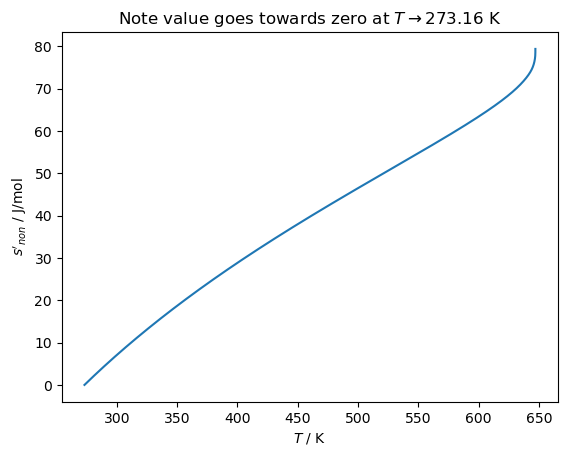 plt.gca().set(ylabel=r"$s'_{non}$ / J/mol", xlabel='$T$ / K')