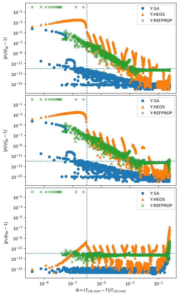When superancillaries are enabled, the “critical point” is the numerical one that is obtained by enforcing \(\left(\frac{\partial p}{\partial \rho}\right)_T = \left(\frac{\partial^2 p}{\partial \rho^2}\right)_T = 0\), rather than the one reported by the EOS developers. This is because the superancillaries are developed to try to fix the critical region as well as possible. The differences can be sometimes not too small: An Analysis of the Critical Region of Multiparameter Equations of State