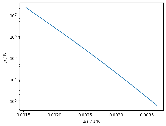 plt.yscale('log'); plt.gca().set(xlabel='$1/T$ / 1/K', ylabel='$p$ / Pa');