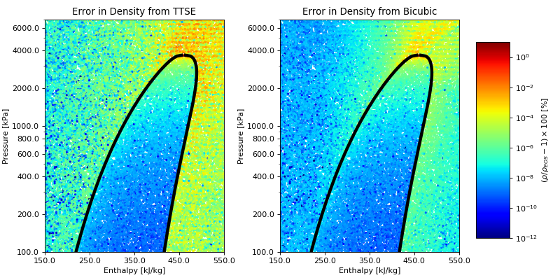 Here is a simple comparison of accuracy, the density is obtained for R245fa using the EOS, TTSE extrapolation, and Bicubic interpolation