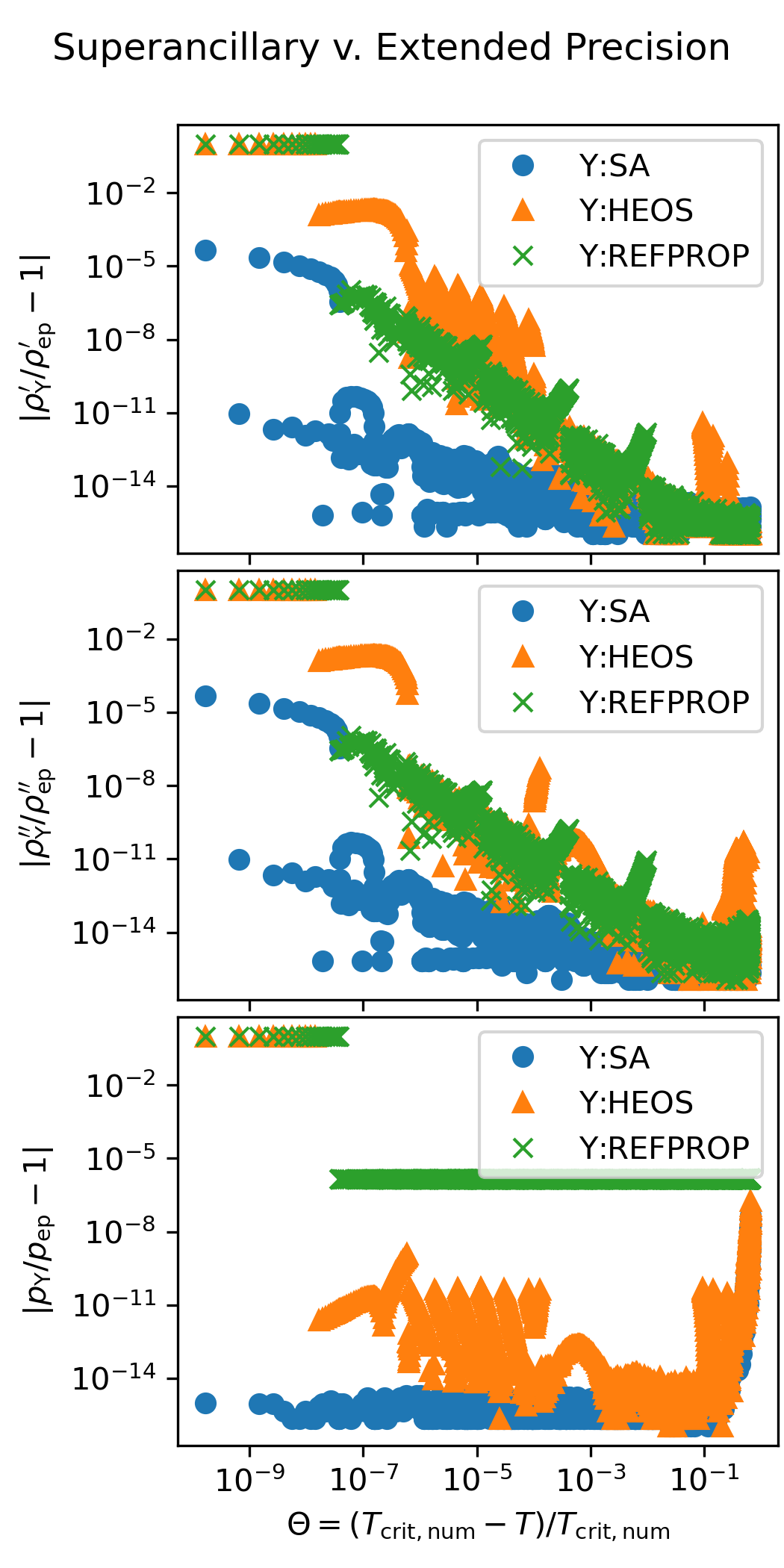 The following figure shows the accuracy of the superancillary functions relative to extended precision calculations carried out in C++ with the teqp library. The results of the iterative calculations with REFPROP and CoolProp are also shown.