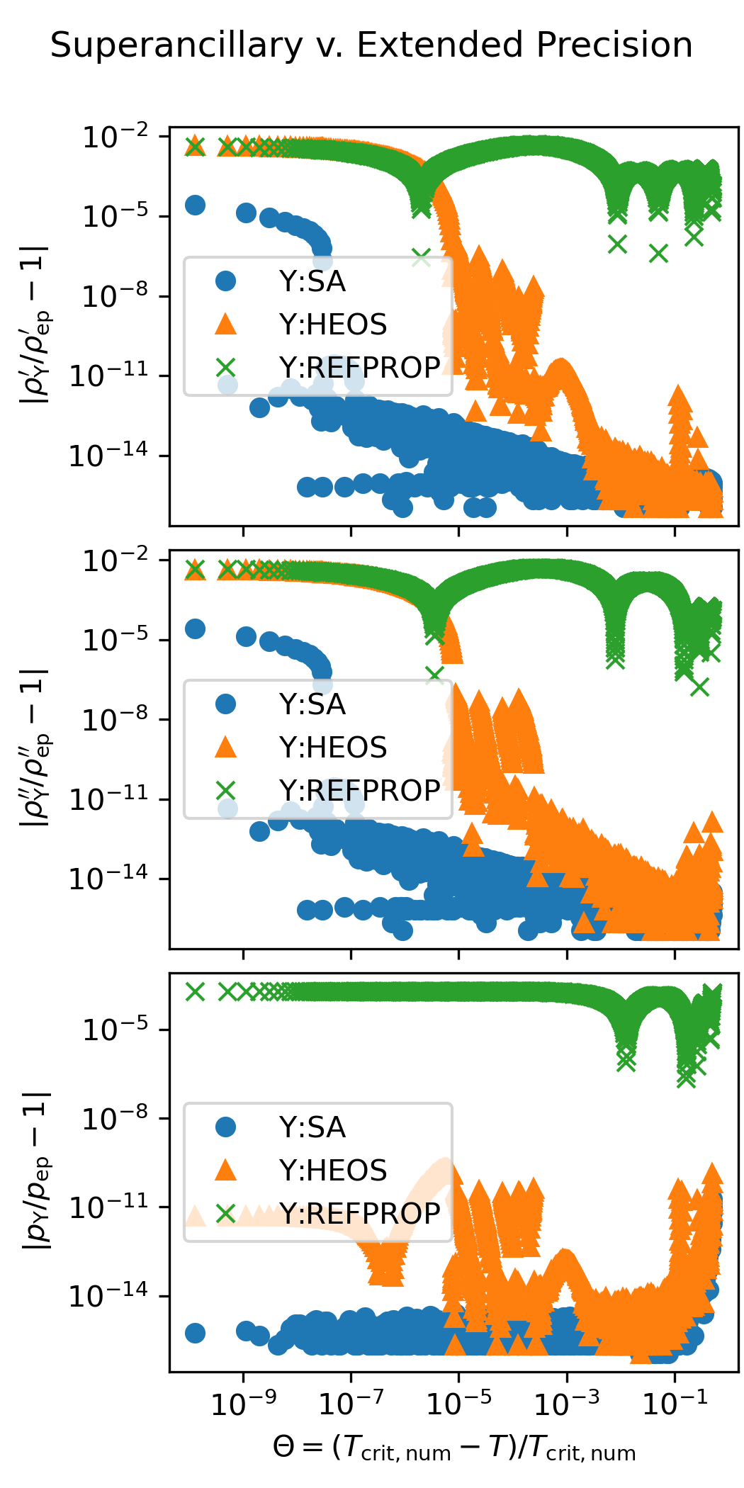 The following figure shows the accuracy of the superancillary functions relative to extended precision calculations carried out in C++ with the teqp library. The results of the iterative calculations with REFPROP and CoolProp are also shown.