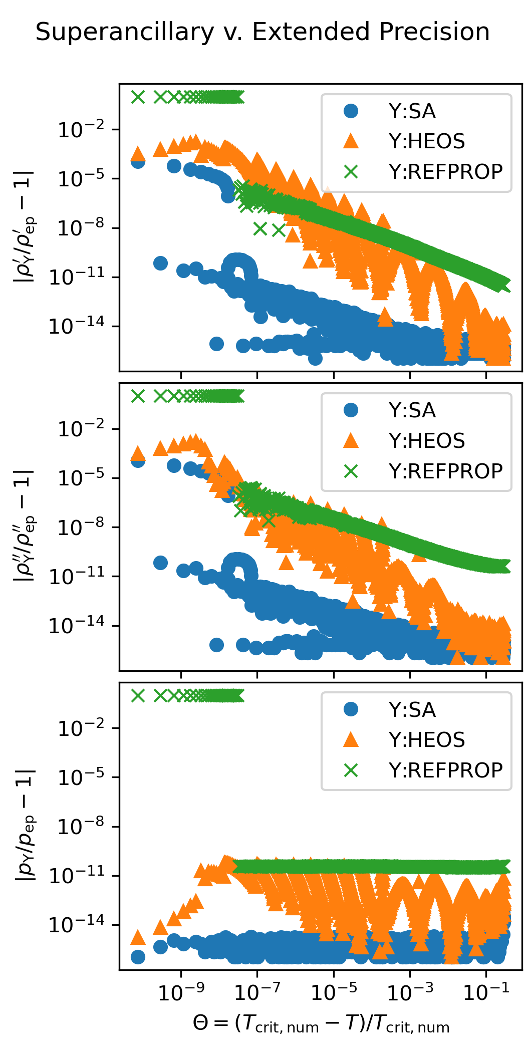 The following figure shows the accuracy of the superancillary functions relative to extended precision calculations carried out in C++ with the teqp library. The results of the iterative calculations with REFPROP and CoolProp are also shown.