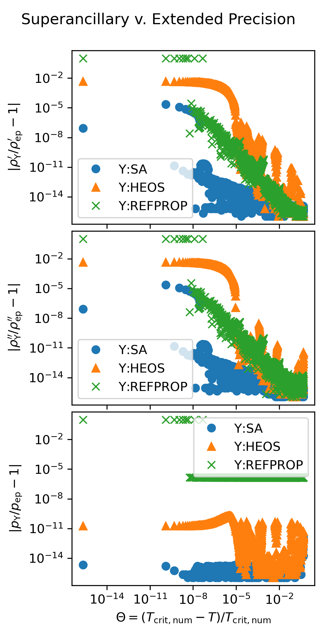 The following figure shows the accuracy of the superancillary functions relative to extended precision calculations carried out in C++ with the teqp library. The results of the iterative calculations with REFPROP and CoolProp are also shown.