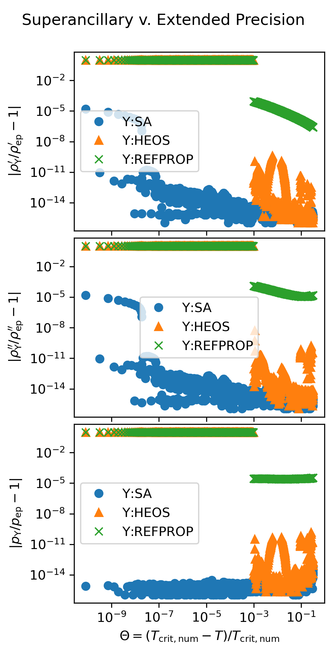 The following figure shows the accuracy of the superancillary functions relative to extended precision calculations carried out in C++ with the teqp library. The results of the iterative calculations with REFPROP and CoolProp are also shown.
