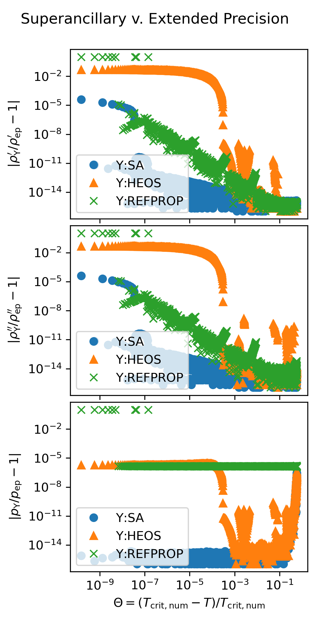 The following figure shows the accuracy of the superancillary functions relative to extended precision calculations carried out in C++ with the teqp library. The results of the iterative calculations with REFPROP and CoolProp are also shown.