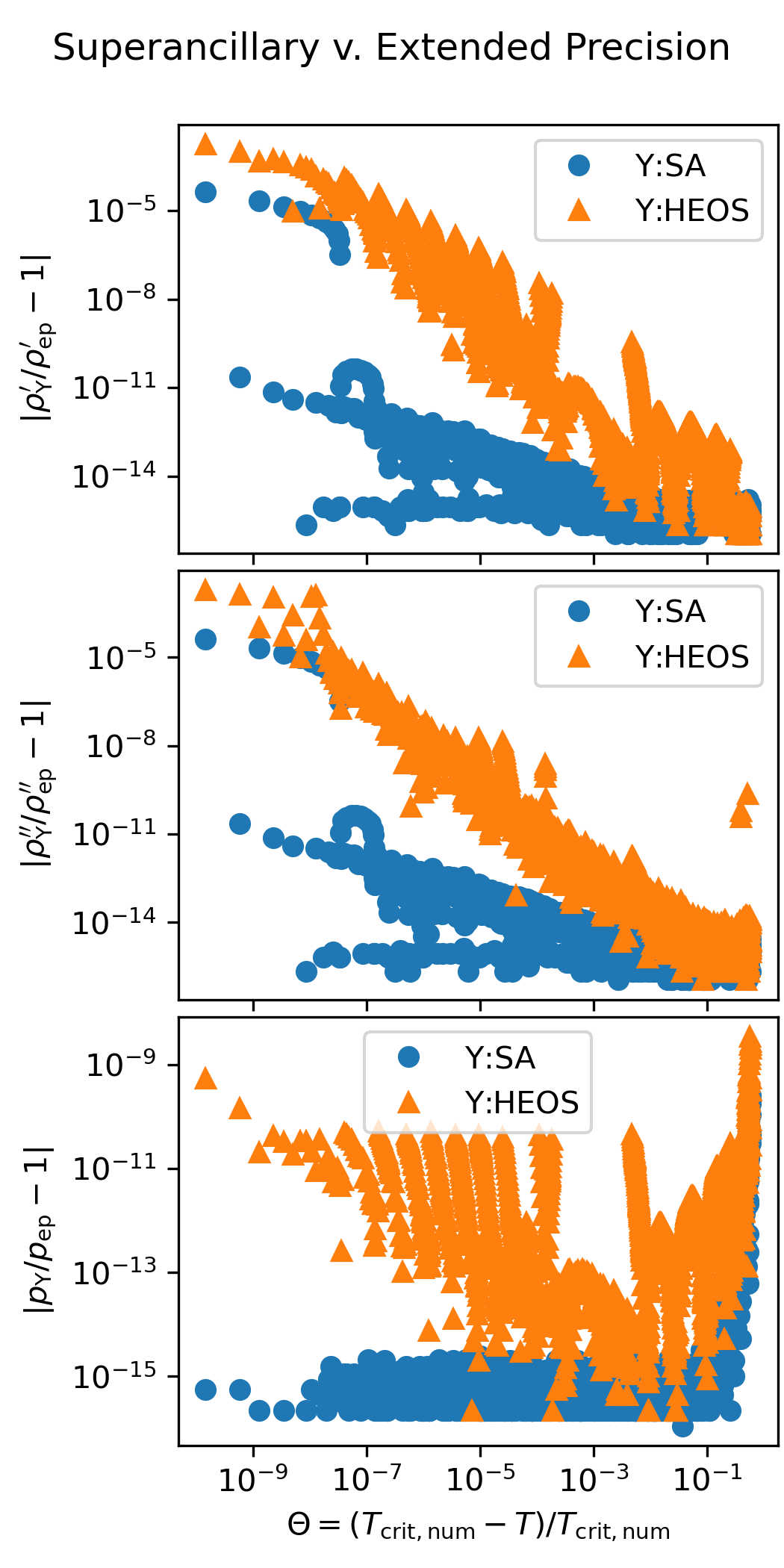 The following figure shows the accuracy of the superancillary functions relative to extended precision calculations carried out in C++ with the teqp library. The results of the iterative calculations with REFPROP and CoolProp are also shown.