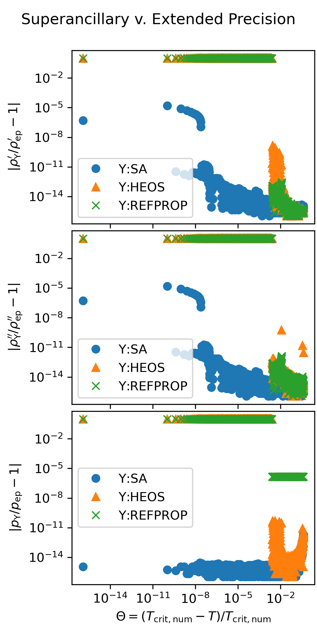 The following figure shows the accuracy of the superancillary functions relative to extended precision calculations carried out in C++ with the teqp library. The results of the iterative calculations with REFPROP and CoolProp are also shown.