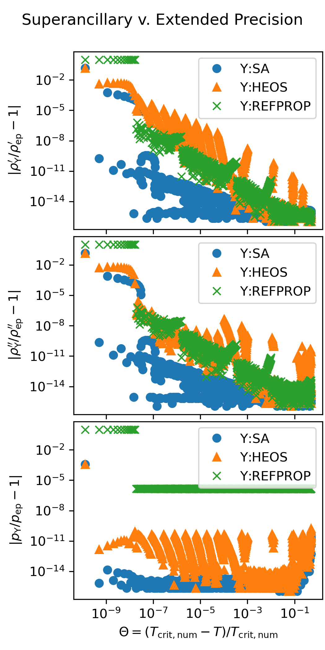 The following figure shows the accuracy of the superancillary functions relative to extended precision calculations carried out in C++ with the teqp library. The results of the iterative calculations with REFPROP and CoolProp are also shown.
