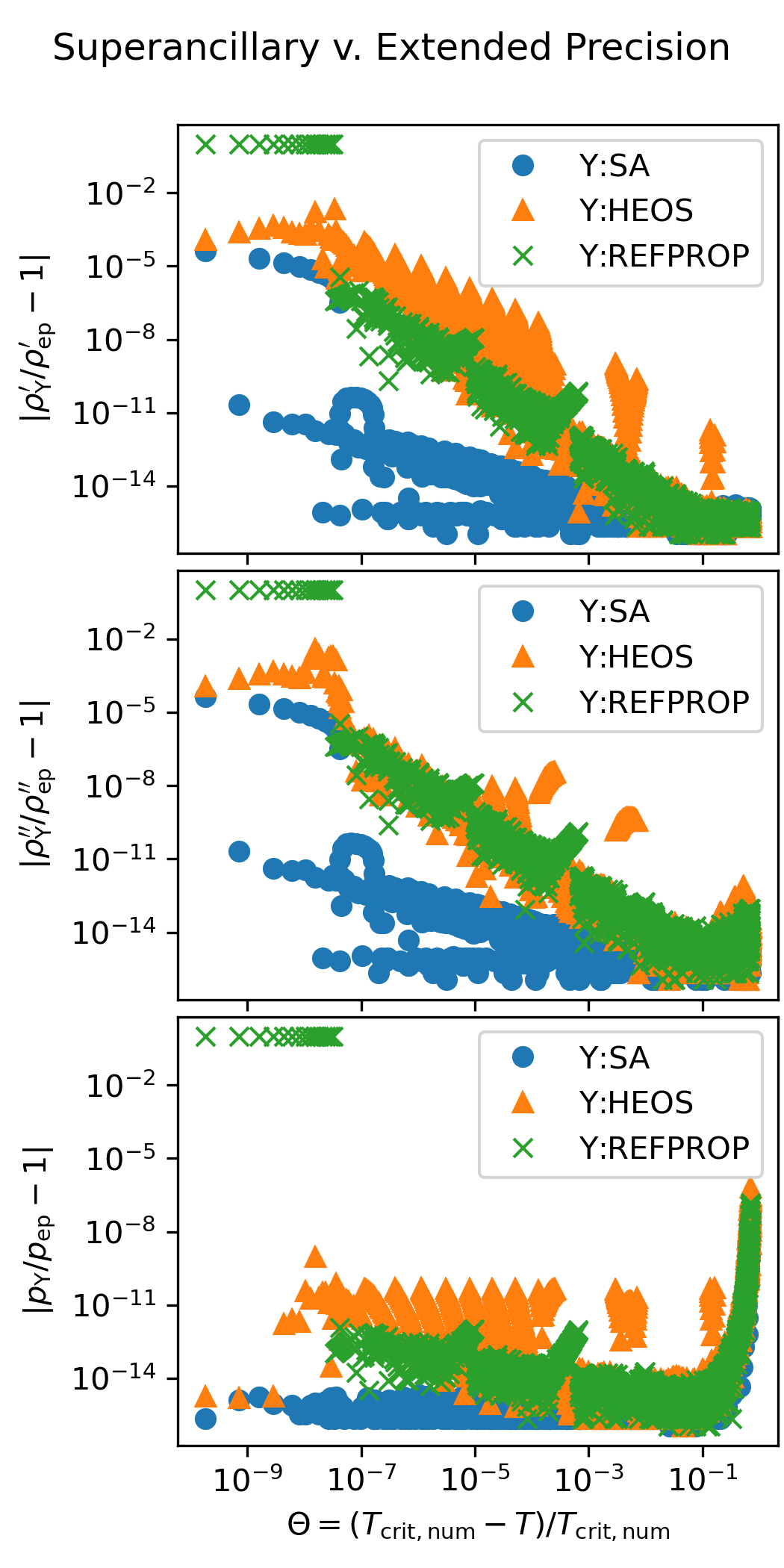 The following figure shows the accuracy of the superancillary functions relative to extended precision calculations carried out in C++ with the teqp library. The results of the iterative calculations with REFPROP and CoolProp are also shown.