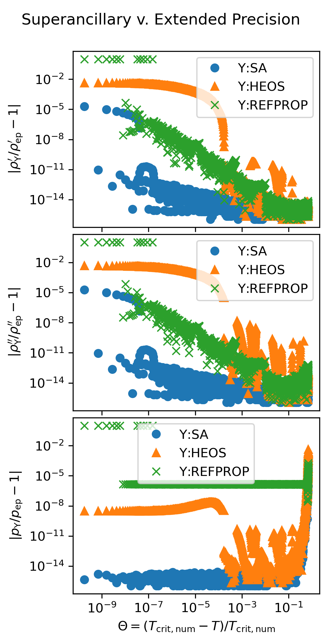 The following figure shows the accuracy of the superancillary functions relative to extended precision calculations carried out in C++ with the teqp library. The results of the iterative calculations with REFPROP and CoolProp are also shown.