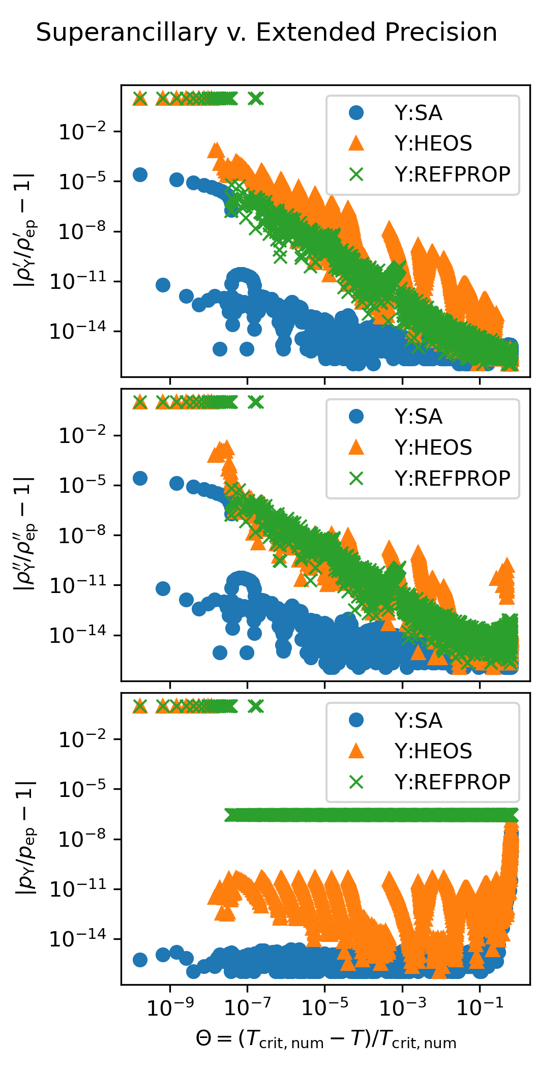 The following figure shows the accuracy of the superancillary functions relative to extended precision calculations carried out in C++ with the teqp library. The results of the iterative calculations with REFPROP and CoolProp are also shown.