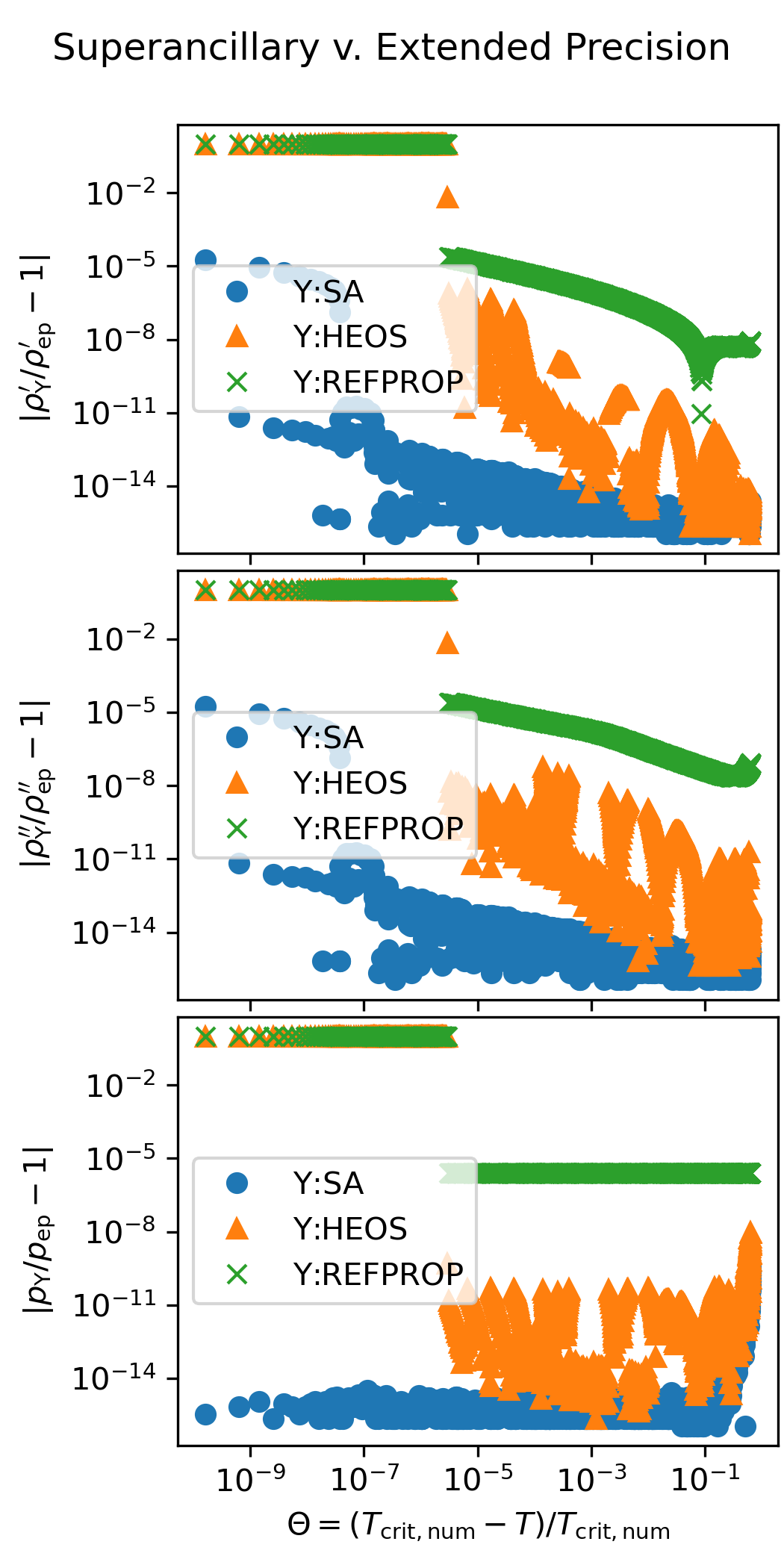 The following figure shows the accuracy of the superancillary functions relative to extended precision calculations carried out in C++ with the teqp library. The results of the iterative calculations with REFPROP and CoolProp are also shown.