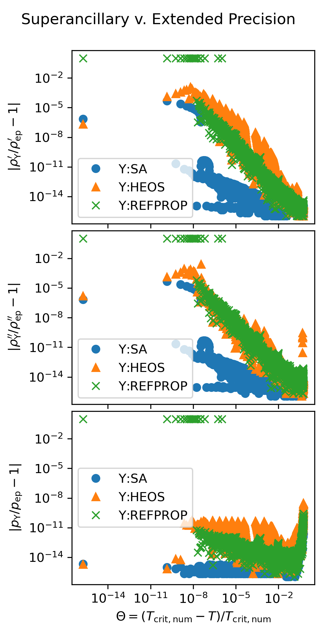 The following figure shows the accuracy of the superancillary functions relative to extended precision calculations carried out in C++ with the teqp library. The results of the iterative calculations with REFPROP and CoolProp are also shown.
