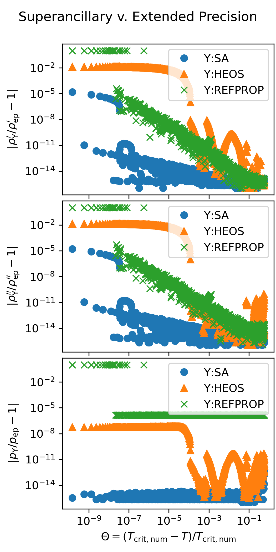 The following figure shows the accuracy of the superancillary functions relative to extended precision calculations carried out in C++ with the teqp library. The results of the iterative calculations with REFPROP and CoolProp are also shown.