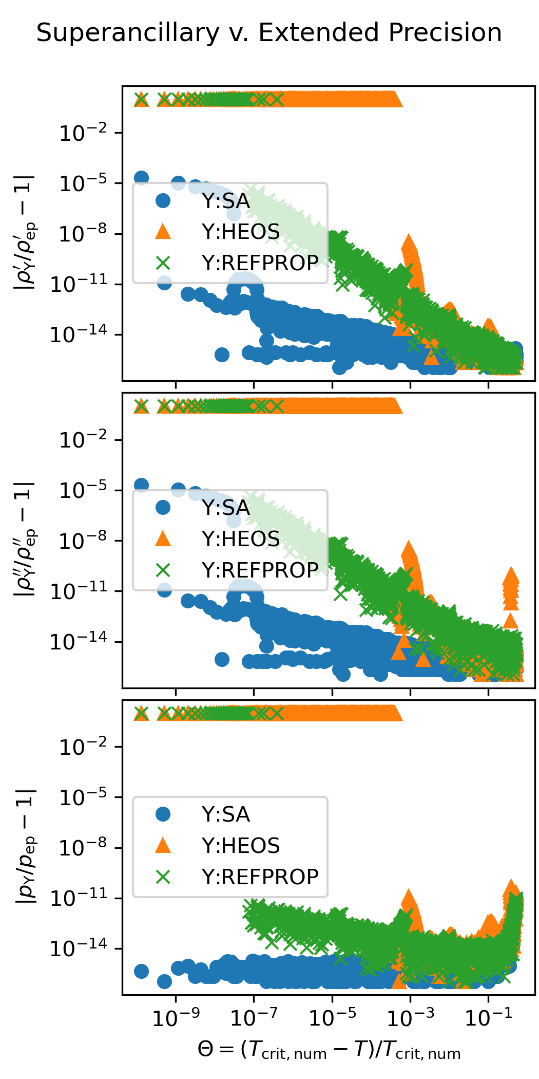 The following figure shows the accuracy of the superancillary functions relative to extended precision calculations carried out in C++ with the teqp library. The results of the iterative calculations with REFPROP and CoolProp are also shown.