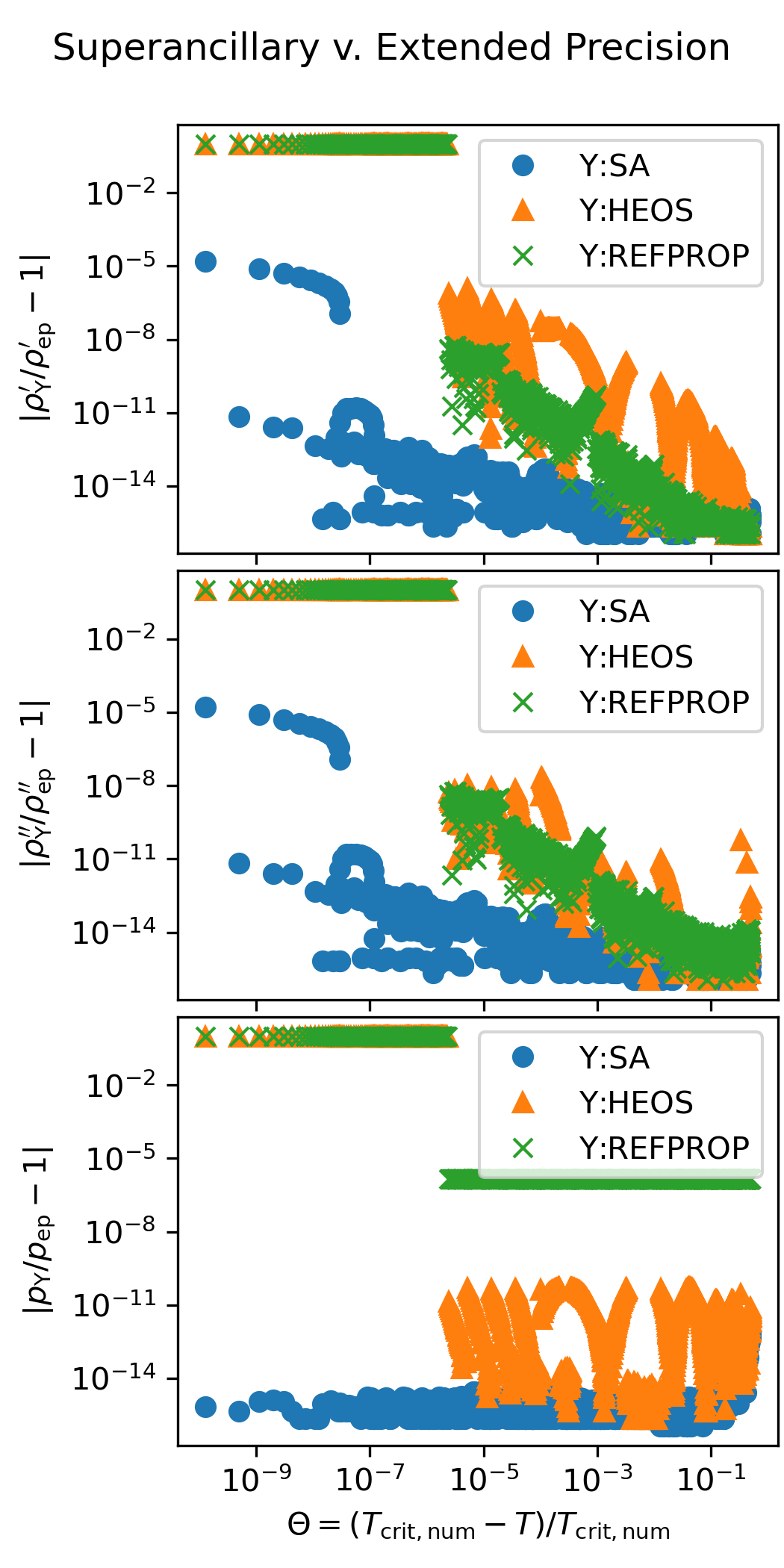 The following figure shows the accuracy of the superancillary functions relative to extended precision calculations carried out in C++ with the teqp library. The results of the iterative calculations with REFPROP and CoolProp are also shown.