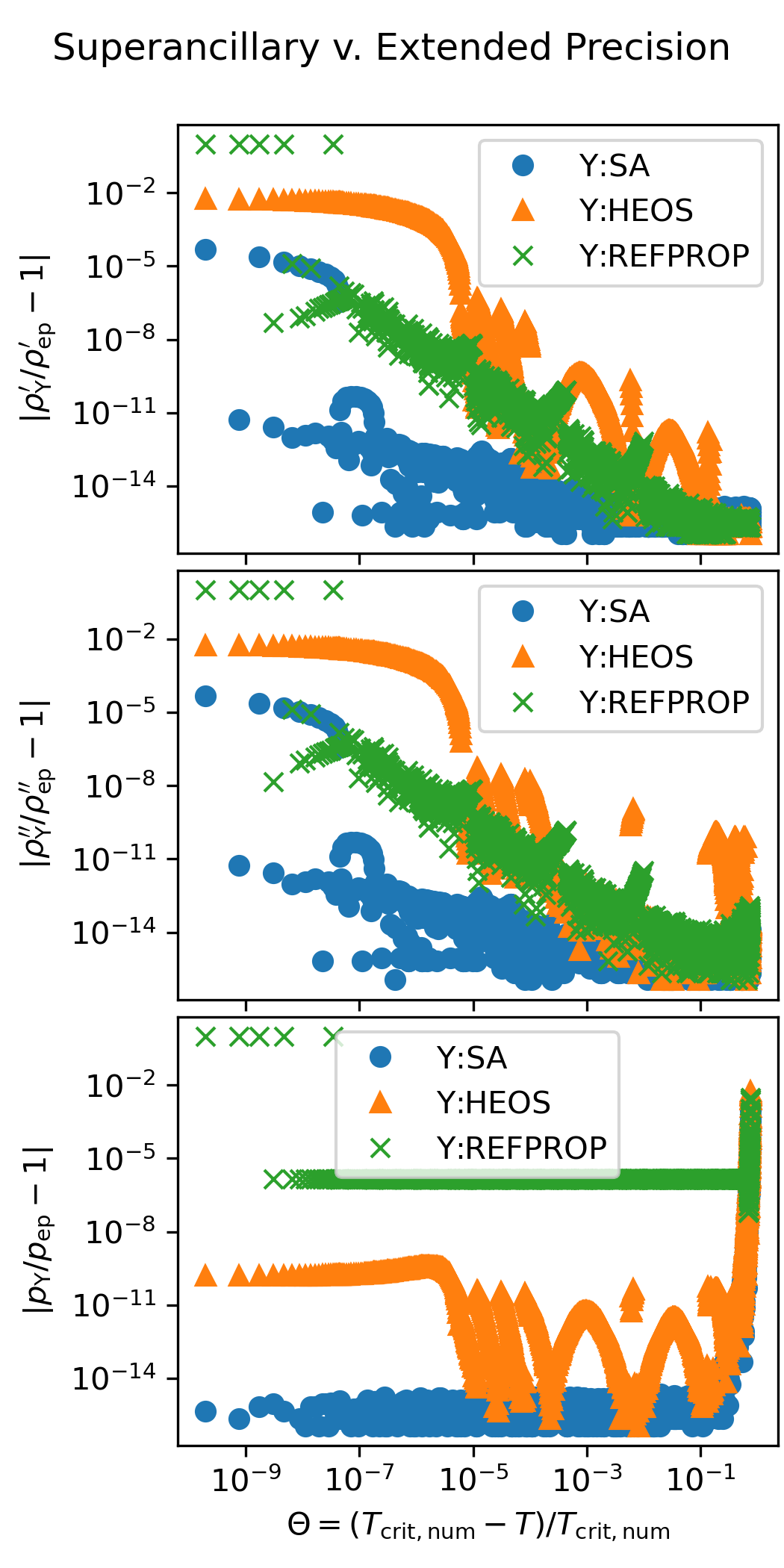 The following figure shows the accuracy of the superancillary functions relative to extended precision calculations carried out in C++ with the teqp library. The results of the iterative calculations with REFPROP and CoolProp are also shown.