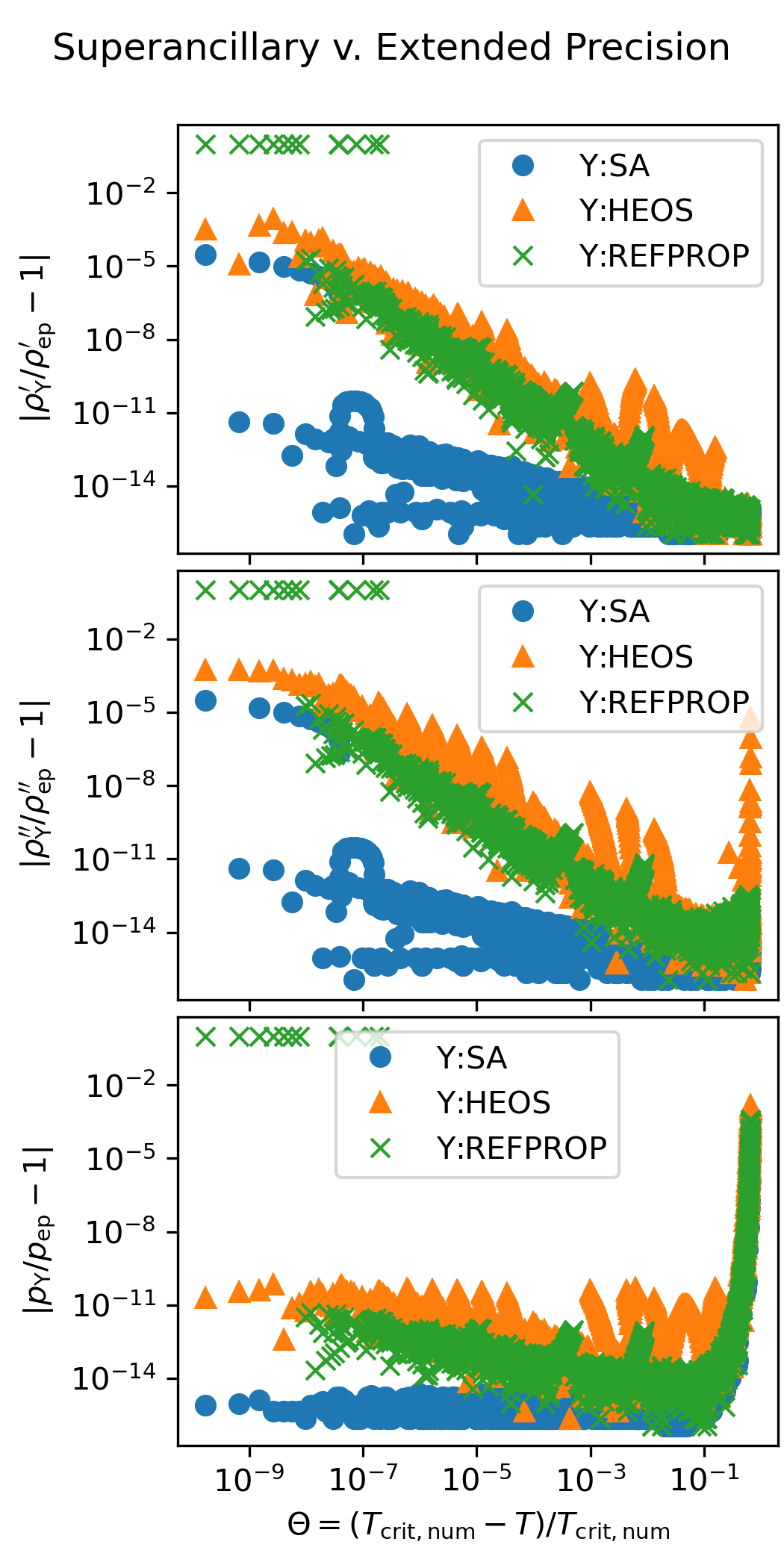 The following figure shows the accuracy of the superancillary functions relative to extended precision calculations carried out in C++ with the teqp library. The results of the iterative calculations with REFPROP and CoolProp are also shown.