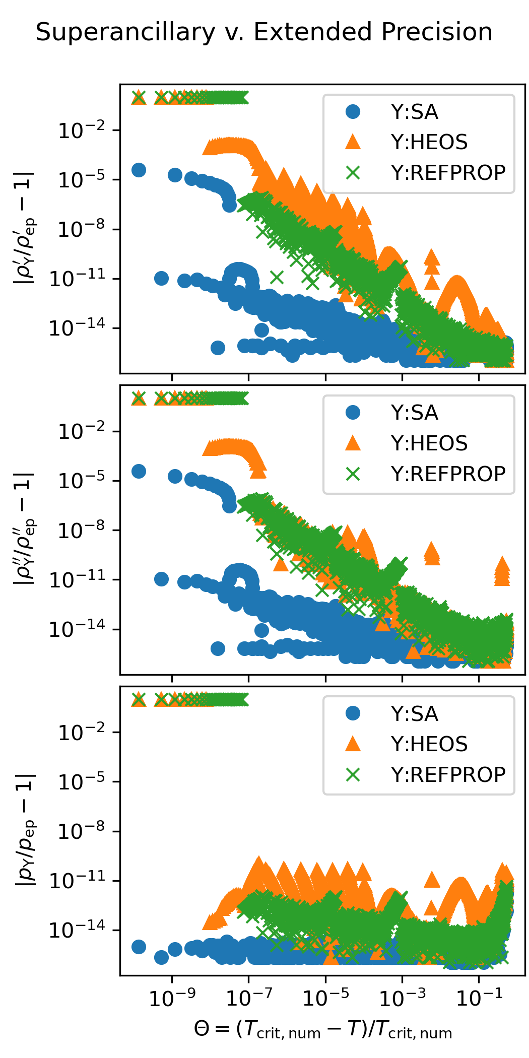 The following figure shows the accuracy of the superancillary functions relative to extended precision calculations carried out in C++ with the teqp library. The results of the iterative calculations with REFPROP and CoolProp are also shown.