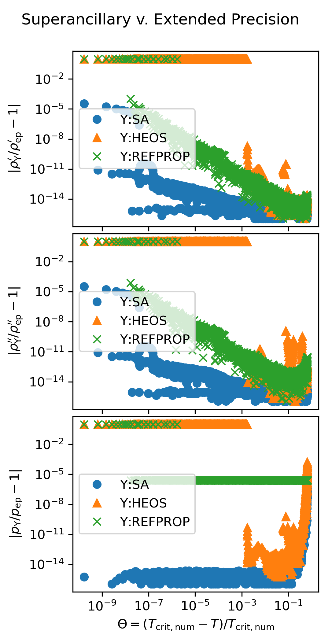 The following figure shows the accuracy of the superancillary functions relative to extended precision calculations carried out in C++ with the teqp library. The results of the iterative calculations with REFPROP and CoolProp are also shown.