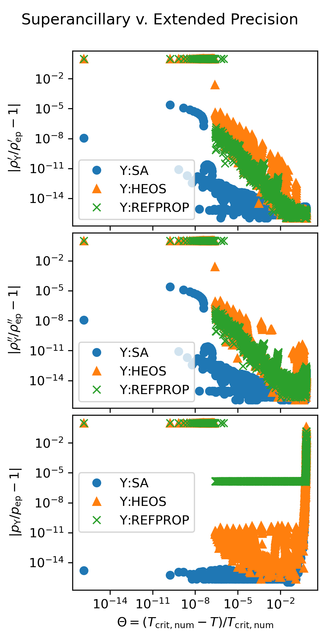 The following figure shows the accuracy of the superancillary functions relative to extended precision calculations carried out in C++ with the teqp library. The results of the iterative calculations with REFPROP and CoolProp are also shown.