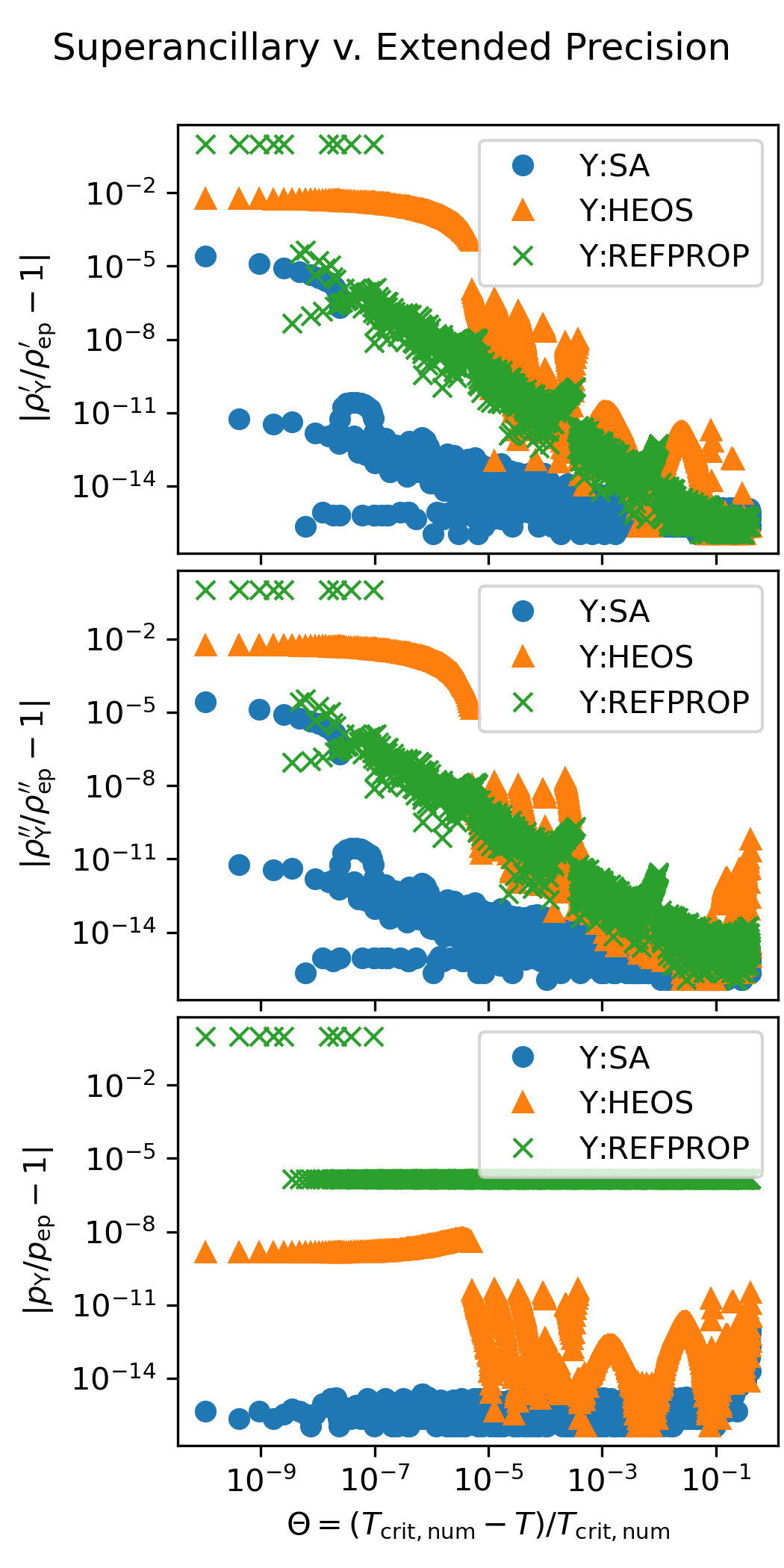 The following figure shows the accuracy of the superancillary functions relative to extended precision calculations carried out in C++ with the teqp library. The results of the iterative calculations with REFPROP and CoolProp are also shown.