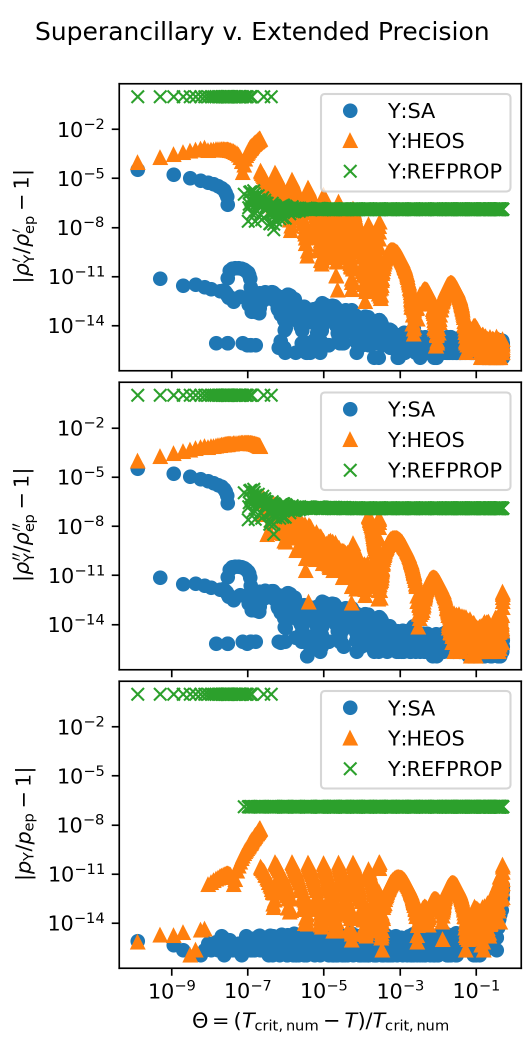 The following figure shows the accuracy of the superancillary functions relative to extended precision calculations carried out in C++ with the teqp library. The results of the iterative calculations with REFPROP and CoolProp are also shown.