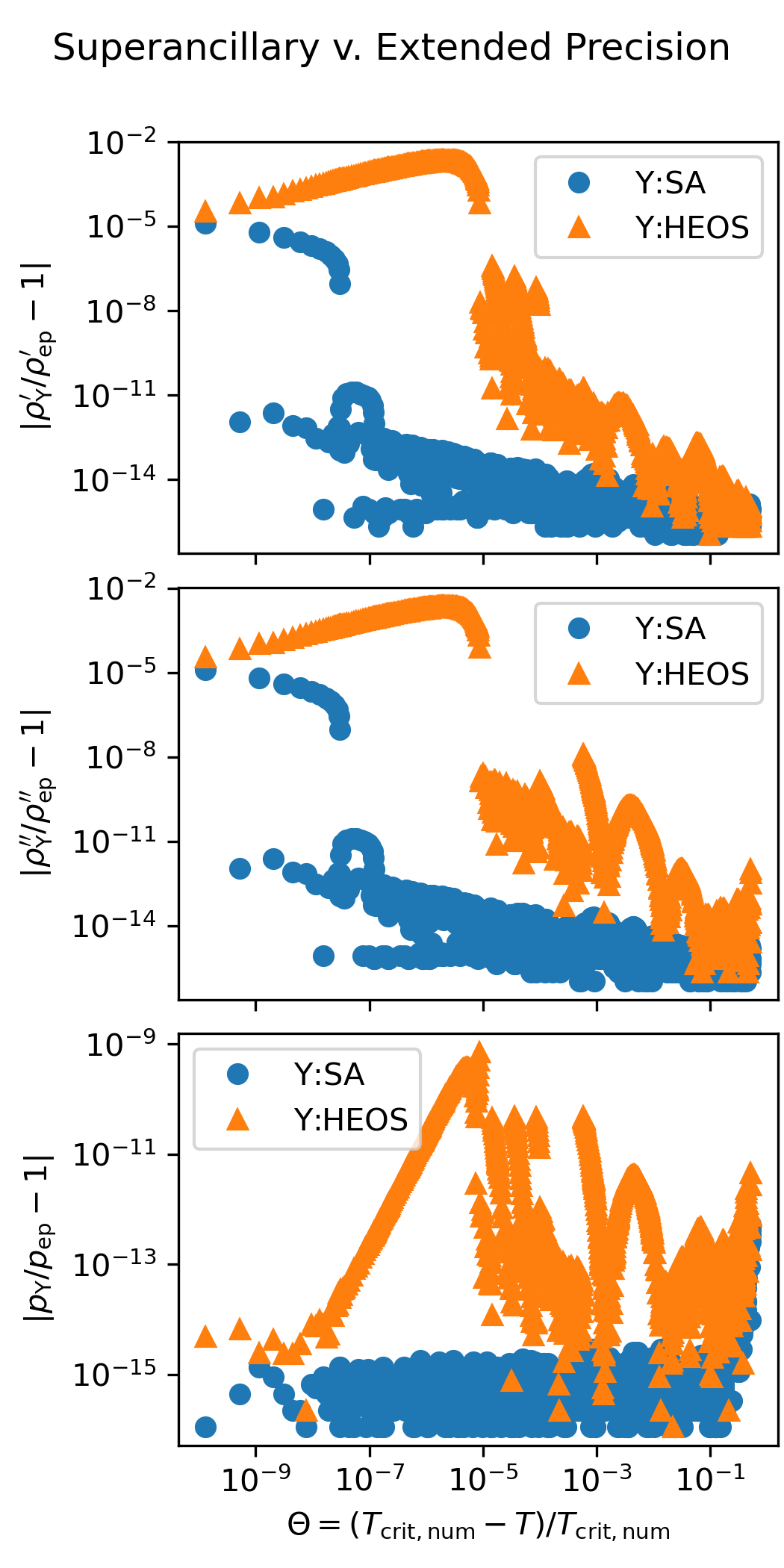 The following figure shows the accuracy of the superancillary functions relative to extended precision calculations carried out in C++ with the teqp library. The results of the iterative calculations with REFPROP and CoolProp are also shown.