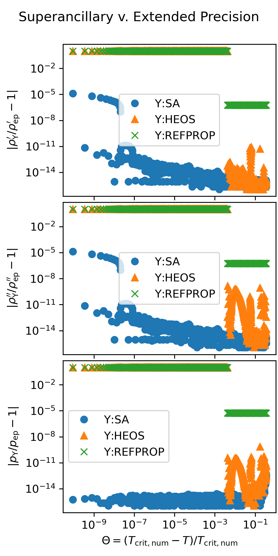 The following figure shows the accuracy of the superancillary functions relative to extended precision calculations carried out in C++ with the teqp library. The results of the iterative calculations with REFPROP and CoolProp are also shown.