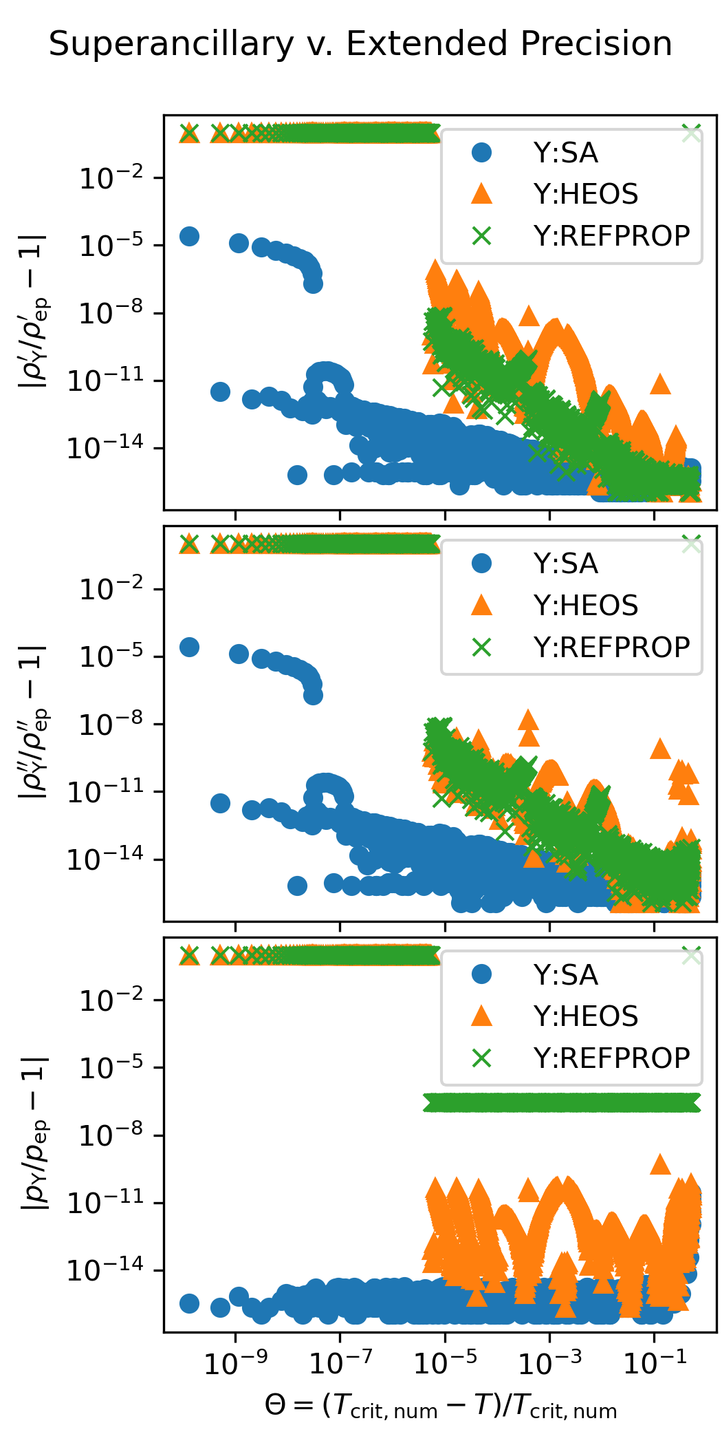 The following figure shows the accuracy of the superancillary functions relative to extended precision calculations carried out in C++ with the teqp library. The results of the iterative calculations with REFPROP and CoolProp are also shown.