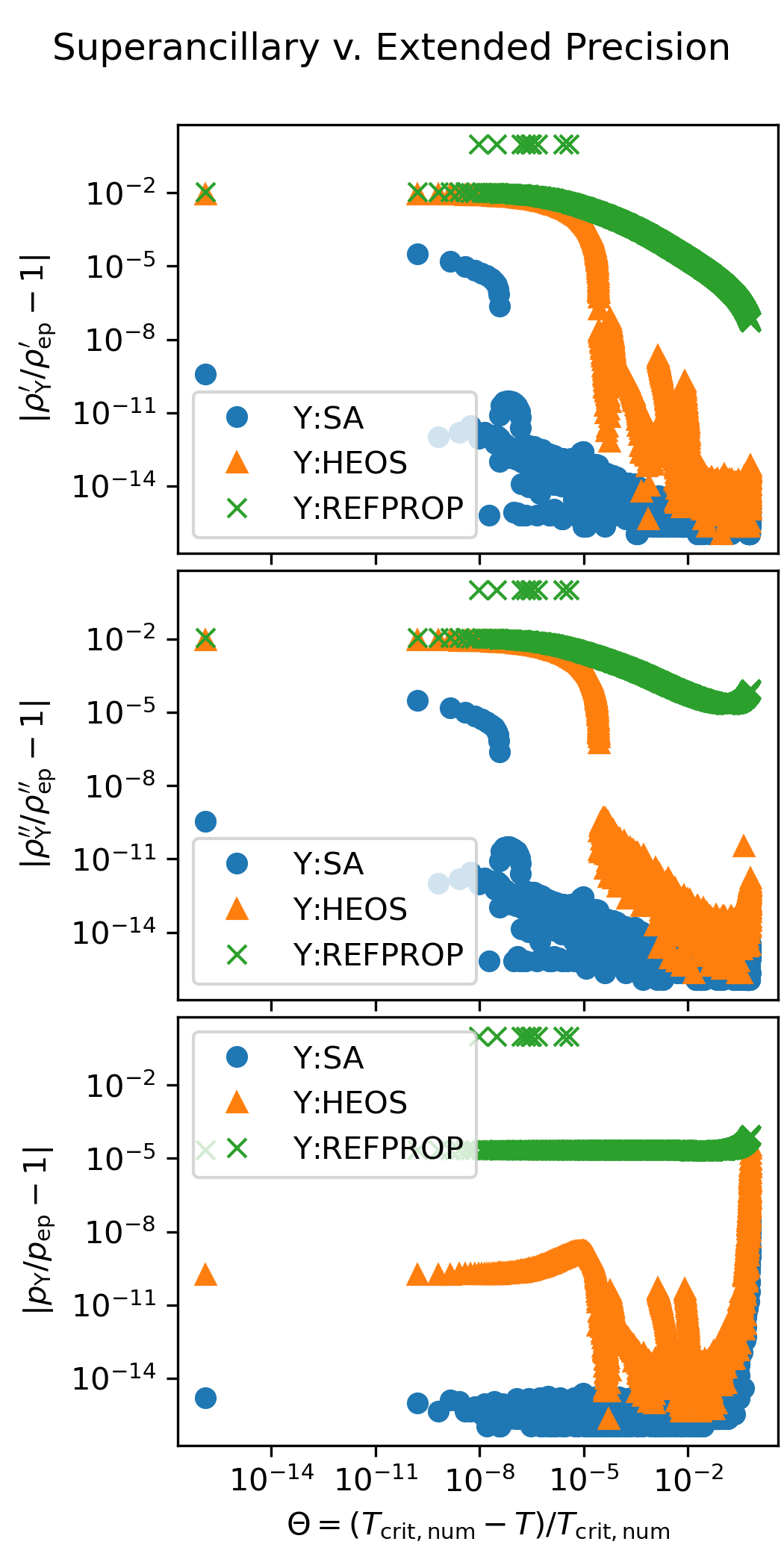 The following figure shows the accuracy of the superancillary functions relative to extended precision calculations carried out in C++ with the teqp library. The results of the iterative calculations with REFPROP and CoolProp are also shown.