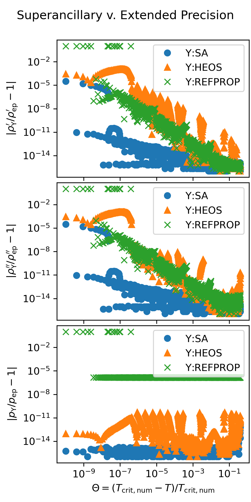 The following figure shows the accuracy of the superancillary functions relative to extended precision calculations carried out in C++ with the teqp library. The results of the iterative calculations with REFPROP and CoolProp are also shown.