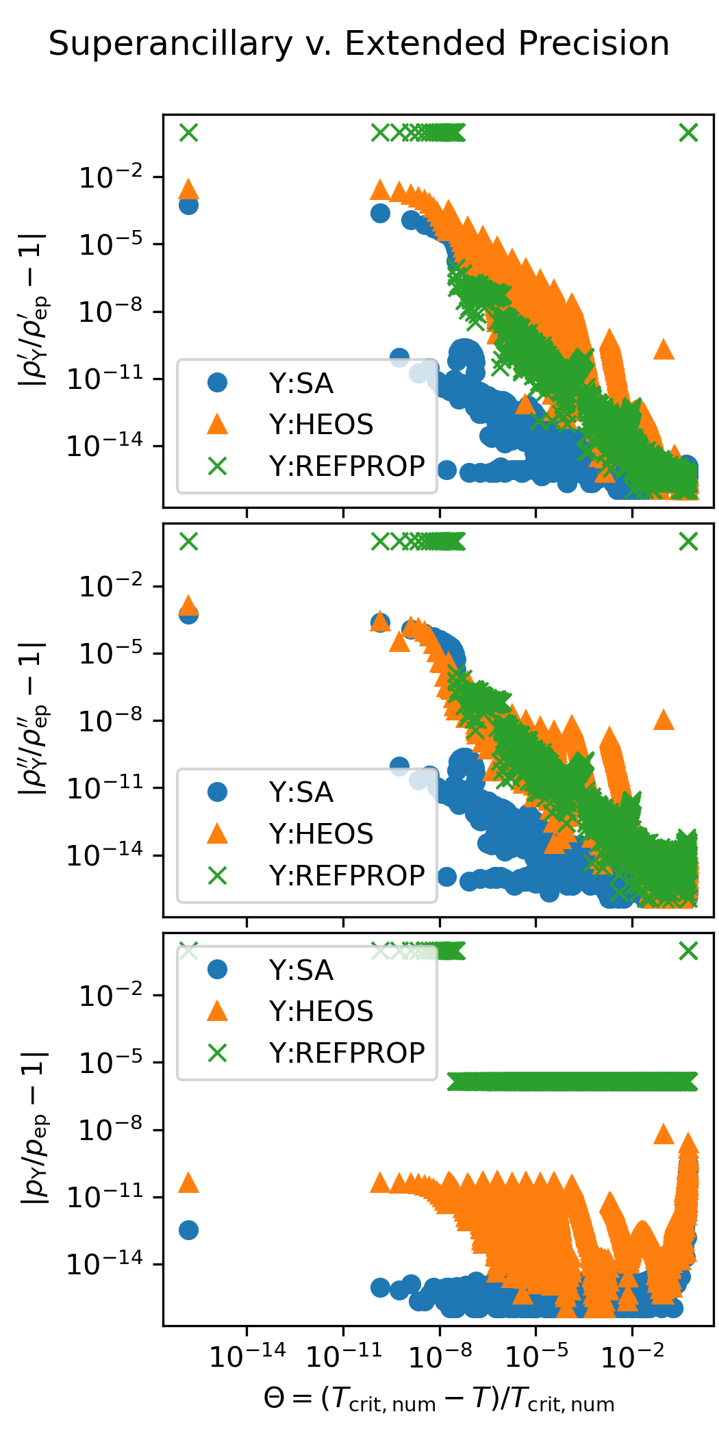 The following figure shows the accuracy of the superancillary functions relative to extended precision calculations carried out in C++ with the teqp library. The results of the iterative calculations with REFPROP and CoolProp are also shown.