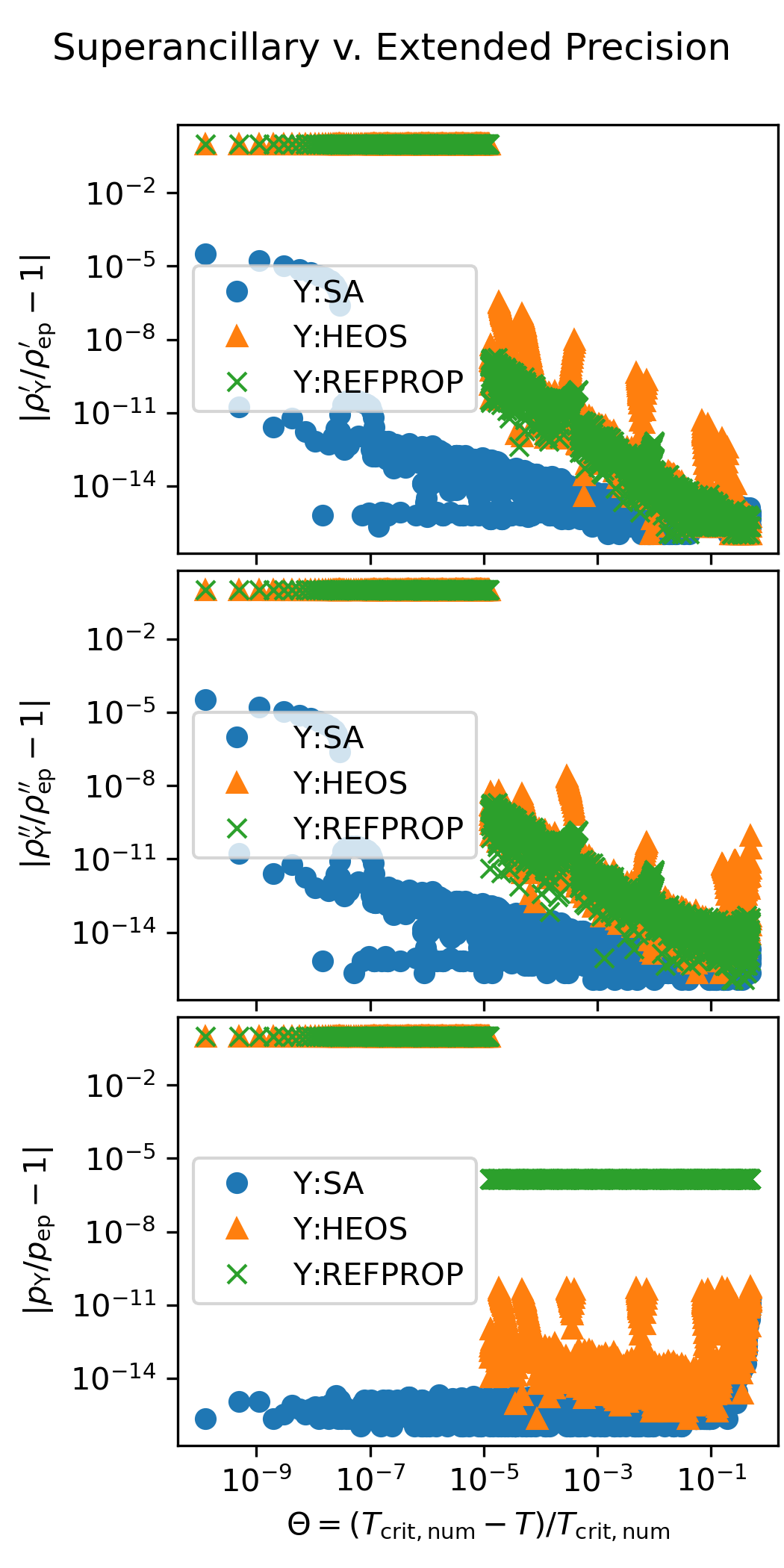The following figure shows the accuracy of the superancillary functions relative to extended precision calculations carried out in C++ with the teqp library. The results of the iterative calculations with REFPROP and CoolProp are also shown.