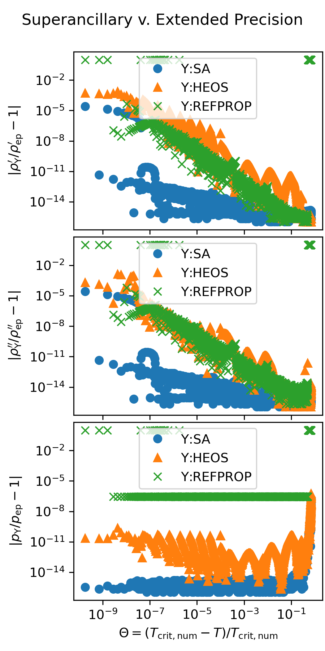 The following figure shows the accuracy of the superancillary functions relative to extended precision calculations carried out in C++ with the teqp library. The results of the iterative calculations with REFPROP and CoolProp are also shown.