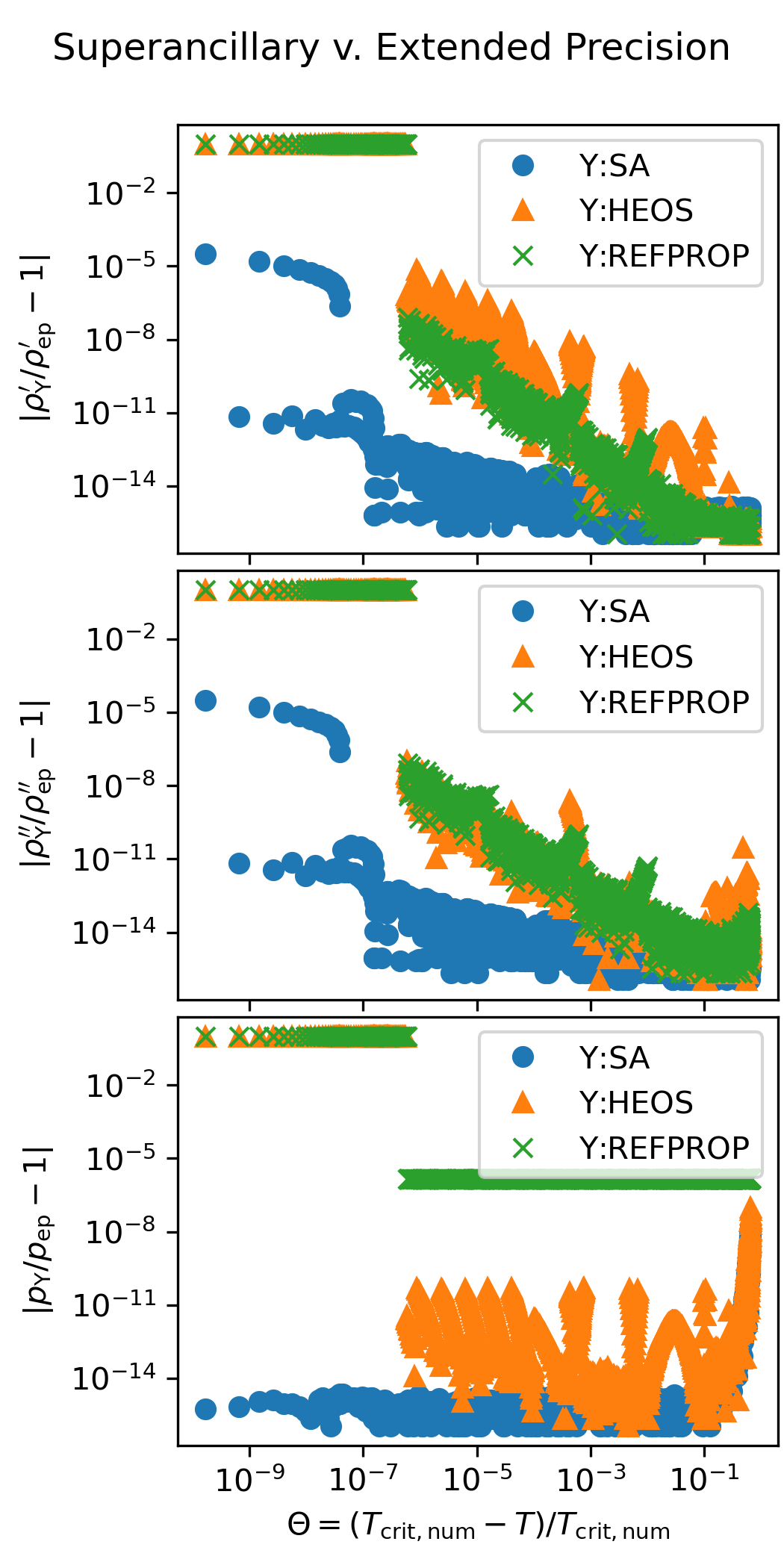 The following figure shows the accuracy of the superancillary functions relative to extended precision calculations carried out in C++ with the teqp library. The results of the iterative calculations with REFPROP and CoolProp are also shown.