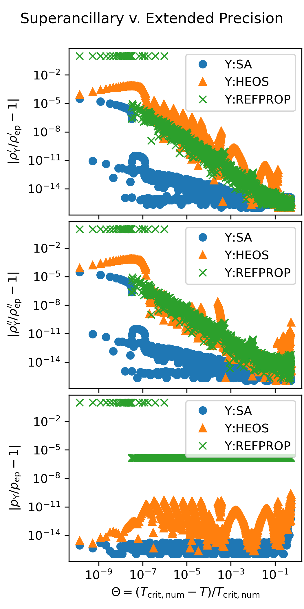 The following figure shows the accuracy of the superancillary functions relative to extended precision calculations carried out in C++ with the teqp library. The results of the iterative calculations with REFPROP and CoolProp are also shown.