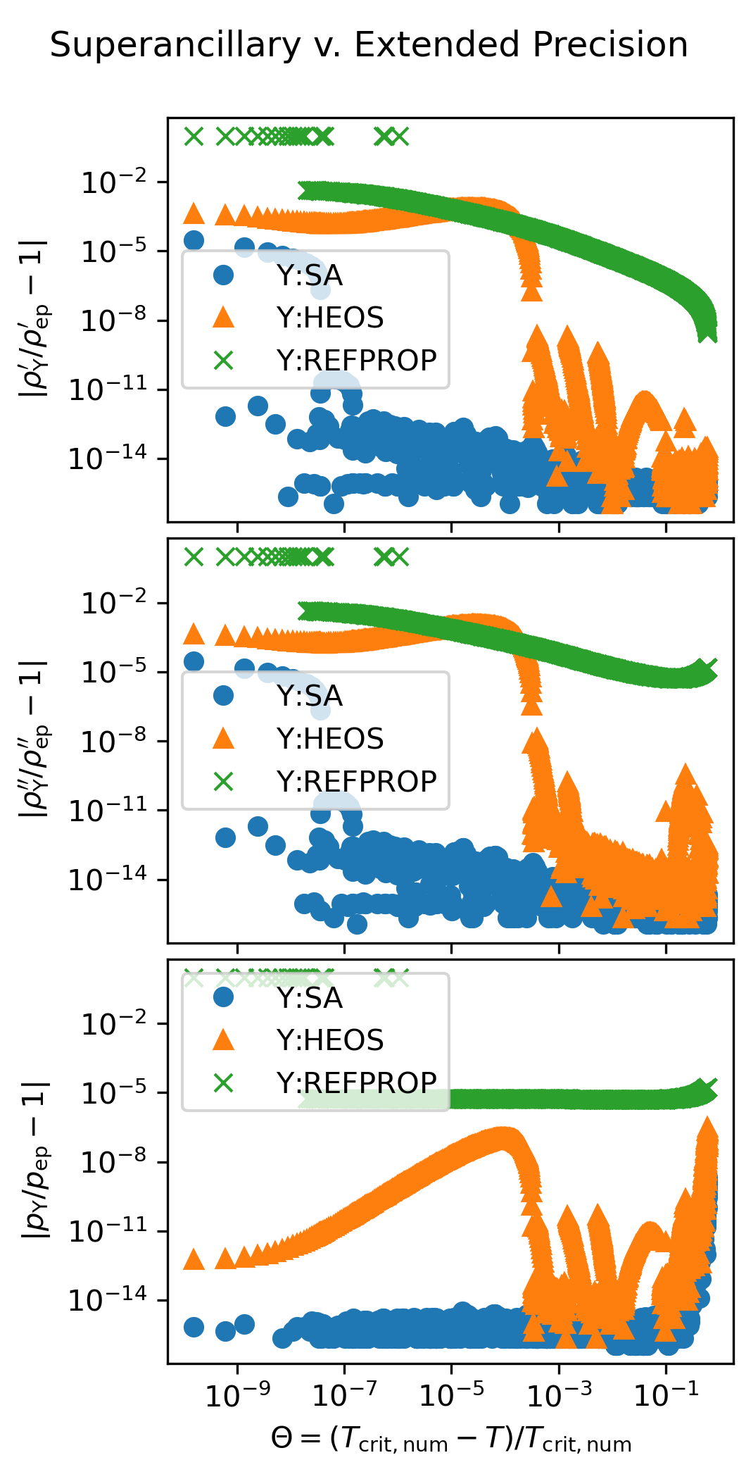 The following figure shows the accuracy of the superancillary functions relative to extended precision calculations carried out in C++ with the teqp library. The results of the iterative calculations with REFPROP and CoolProp are also shown.