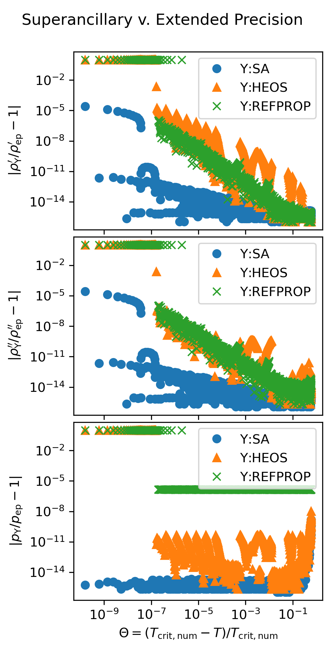 The following figure shows the accuracy of the superancillary functions relative to extended precision calculations carried out in C++ with the teqp library. The results of the iterative calculations with REFPROP and CoolProp are also shown.