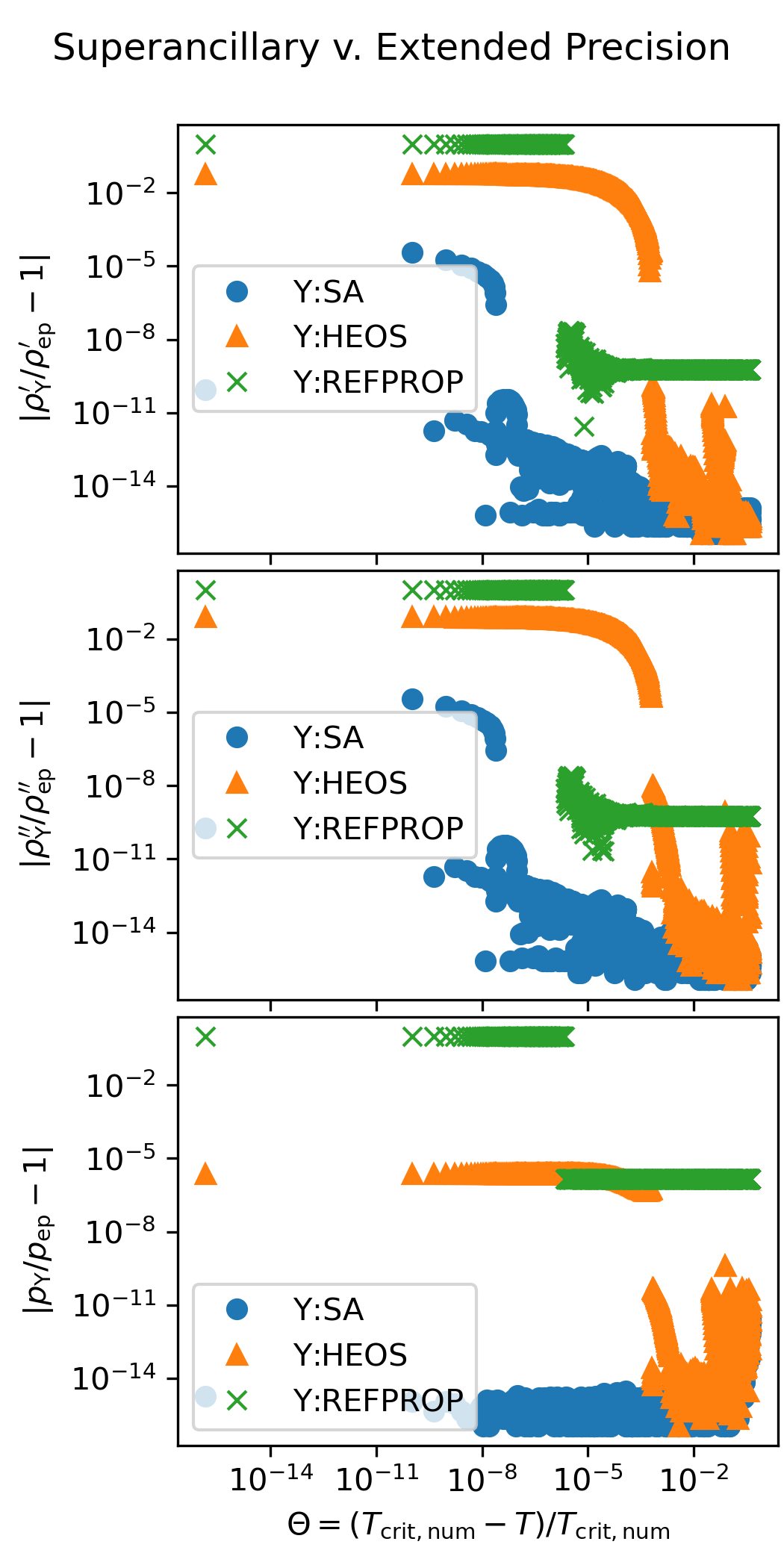 The following figure shows the accuracy of the superancillary functions relative to extended precision calculations carried out in C++ with the teqp library. The results of the iterative calculations with REFPROP and CoolProp are also shown.