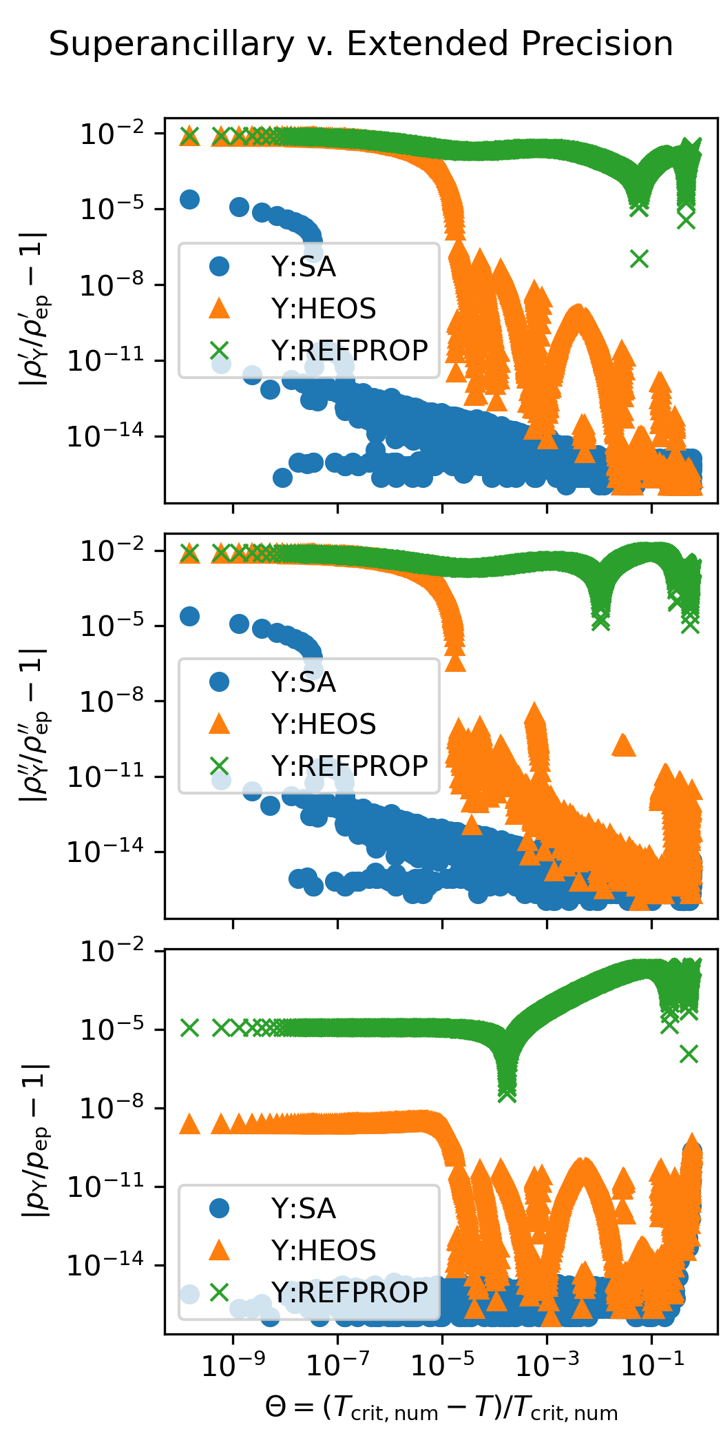 The following figure shows the accuracy of the superancillary functions relative to extended precision calculations carried out in C++ with the teqp library. The results of the iterative calculations with REFPROP and CoolProp are also shown.