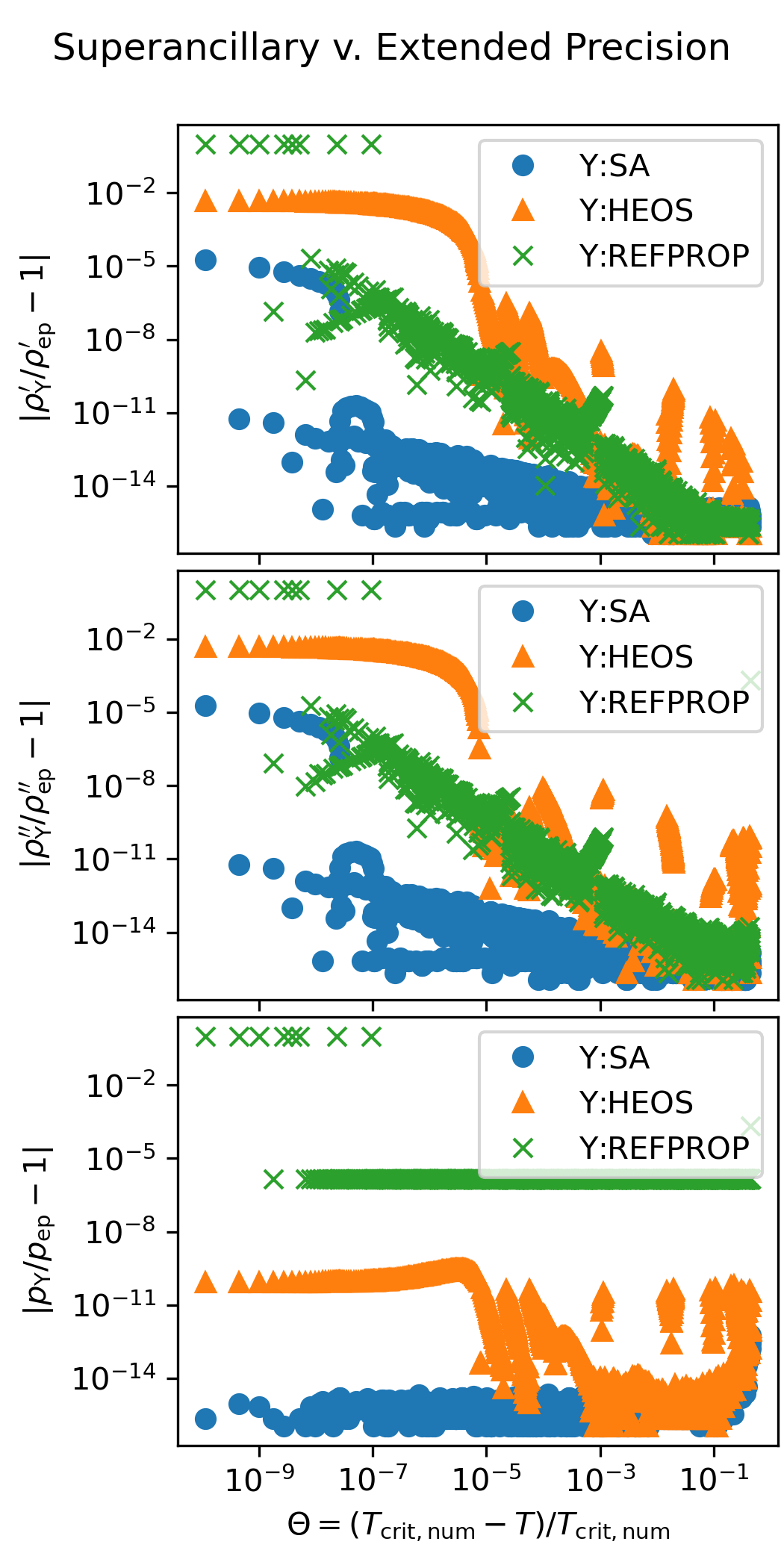 The following figure shows the accuracy of the superancillary functions relative to extended precision calculations carried out in C++ with the teqp library. The results of the iterative calculations with REFPROP and CoolProp are also shown.