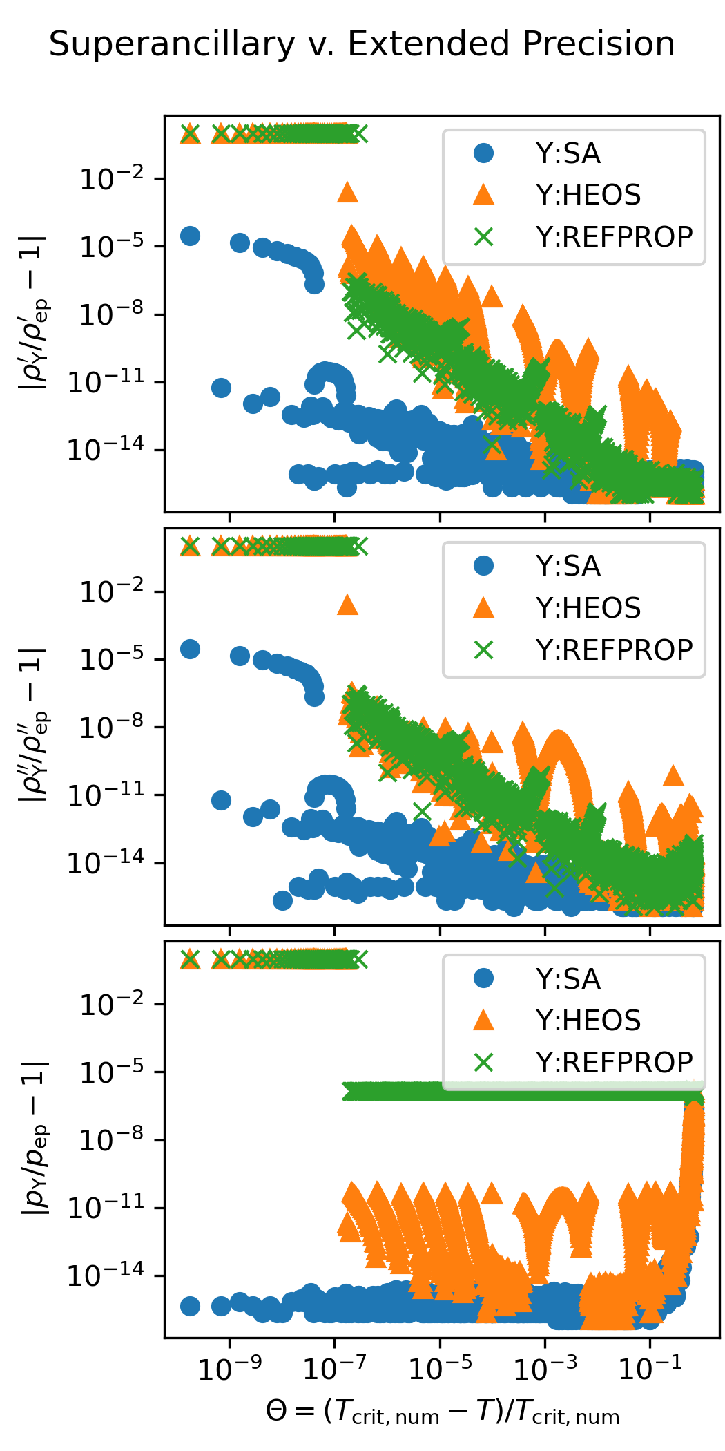 The following figure shows the accuracy of the superancillary functions relative to extended precision calculations carried out in C++ with the teqp library. The results of the iterative calculations with REFPROP and CoolProp are also shown.