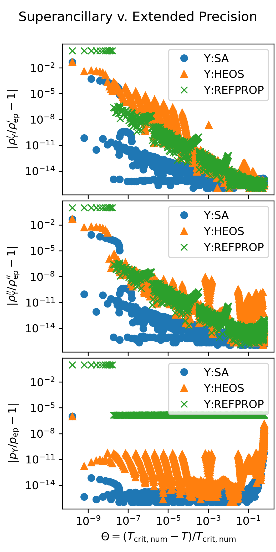 The following figure shows the accuracy of the superancillary functions relative to extended precision calculations carried out in C++ with the teqp library. The results of the iterative calculations with REFPROP and CoolProp are also shown.