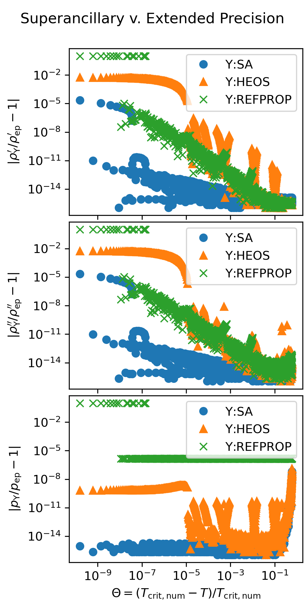 The following figure shows the accuracy of the superancillary functions relative to extended precision calculations carried out in C++ with the teqp library. The results of the iterative calculations with REFPROP and CoolProp are also shown.