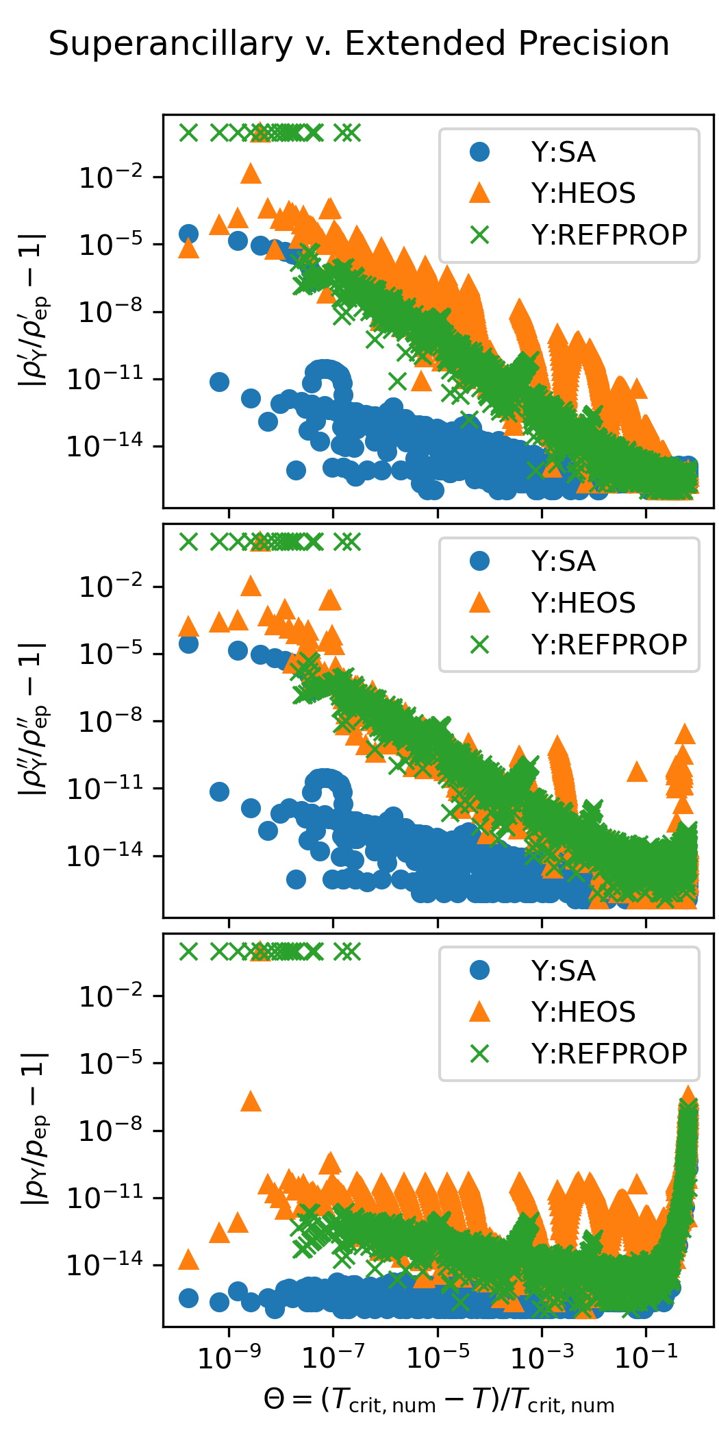 The following figure shows the accuracy of the superancillary functions relative to extended precision calculations carried out in C++ with the teqp library. The results of the iterative calculations with REFPROP and CoolProp are also shown.