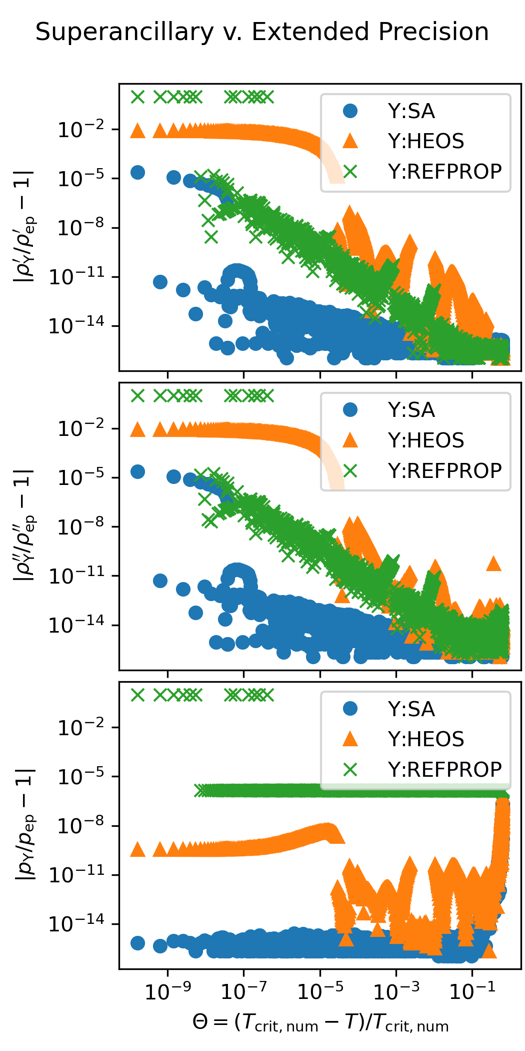 The following figure shows the accuracy of the superancillary functions relative to extended precision calculations carried out in C++ with the teqp library. The results of the iterative calculations with REFPROP and CoolProp are also shown.