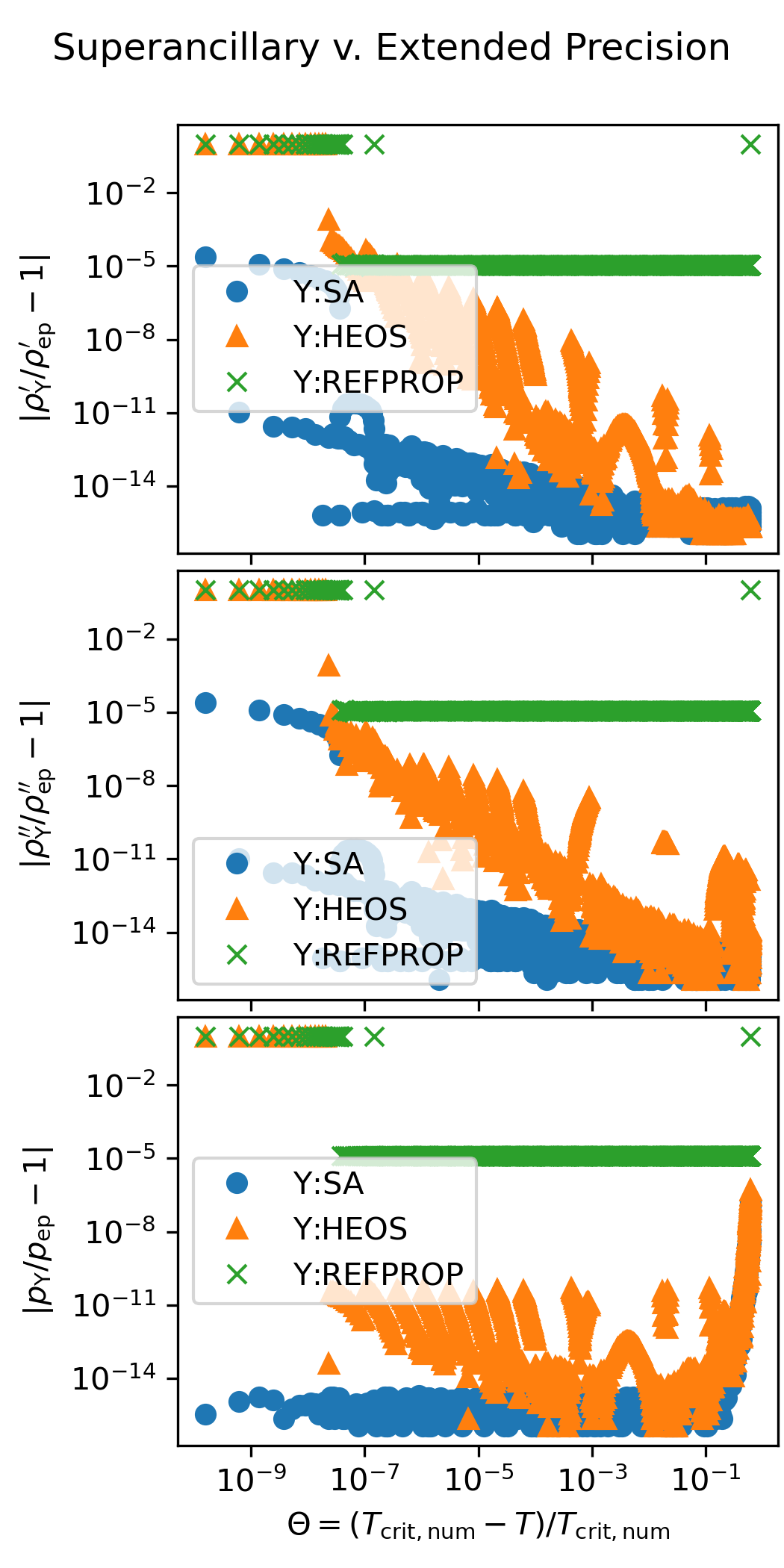 The following figure shows the accuracy of the superancillary functions relative to extended precision calculations carried out in C++ with the teqp library. The results of the iterative calculations with REFPROP and CoolProp are also shown.